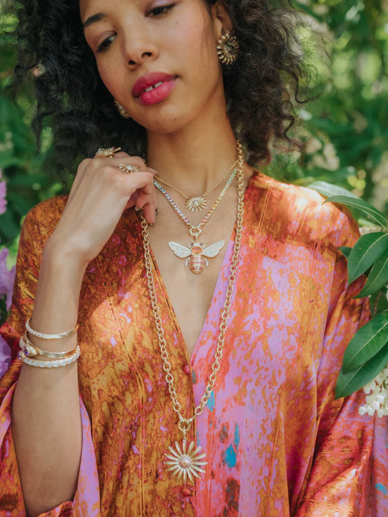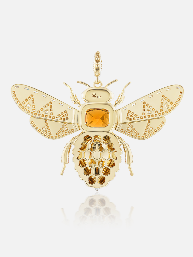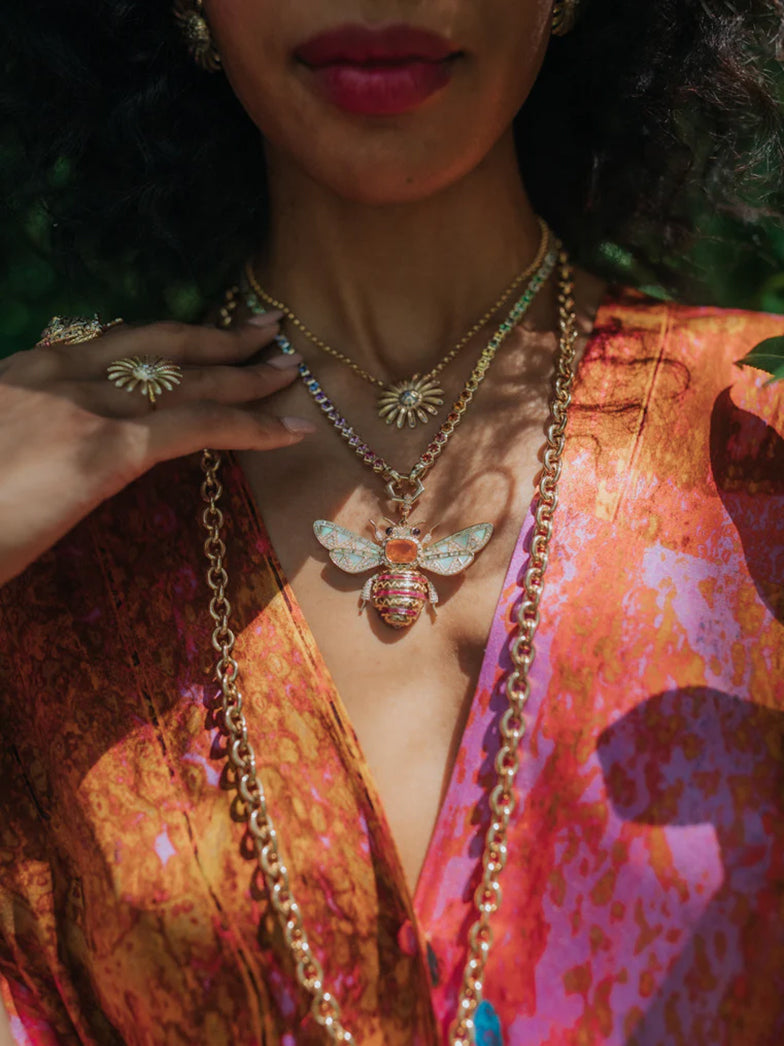 18k yellow gold XL Queen Bee pendant featuring a fire opal center, pink sapphire, amethyst, diamond and white opal details. A captivating combination of whimsy and signature Harwell Godfrey patterns all in one pendant.