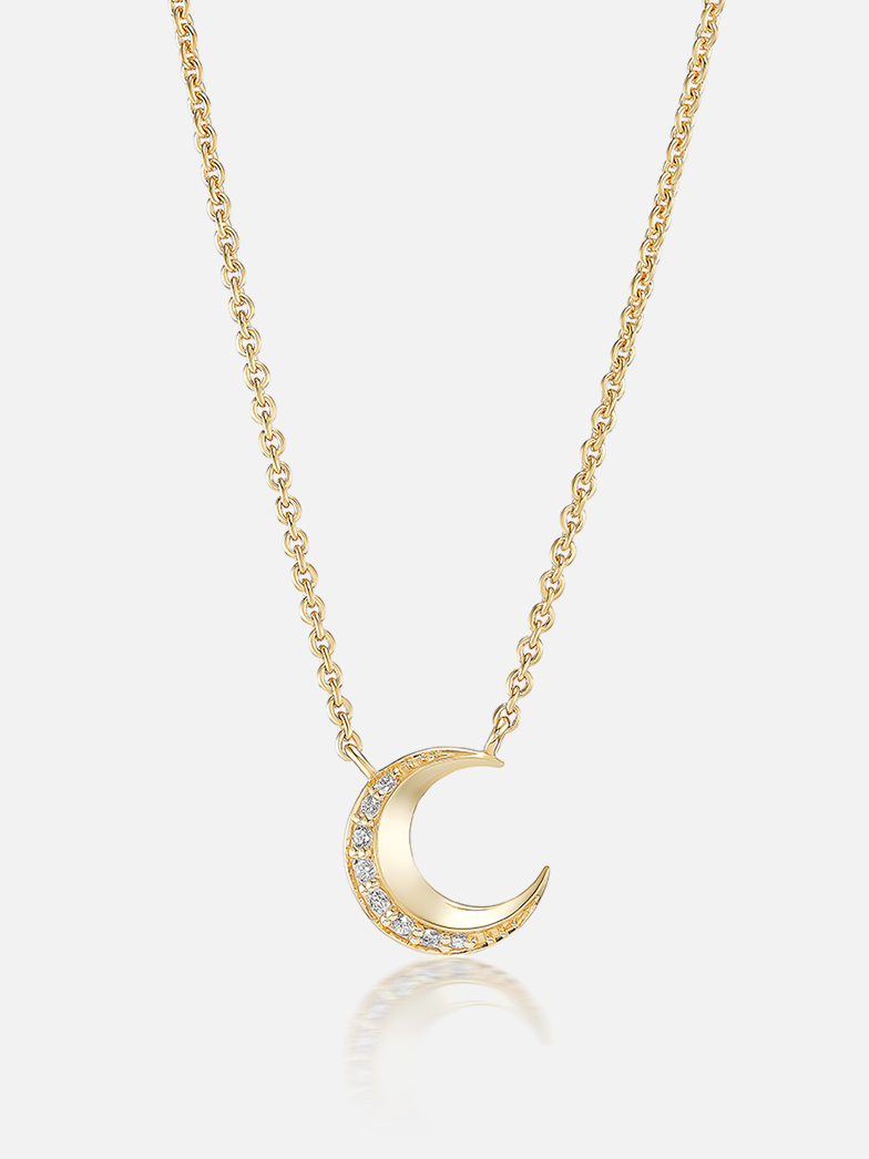 18k yellow gold tiny moon pendant necklace with diamond details.