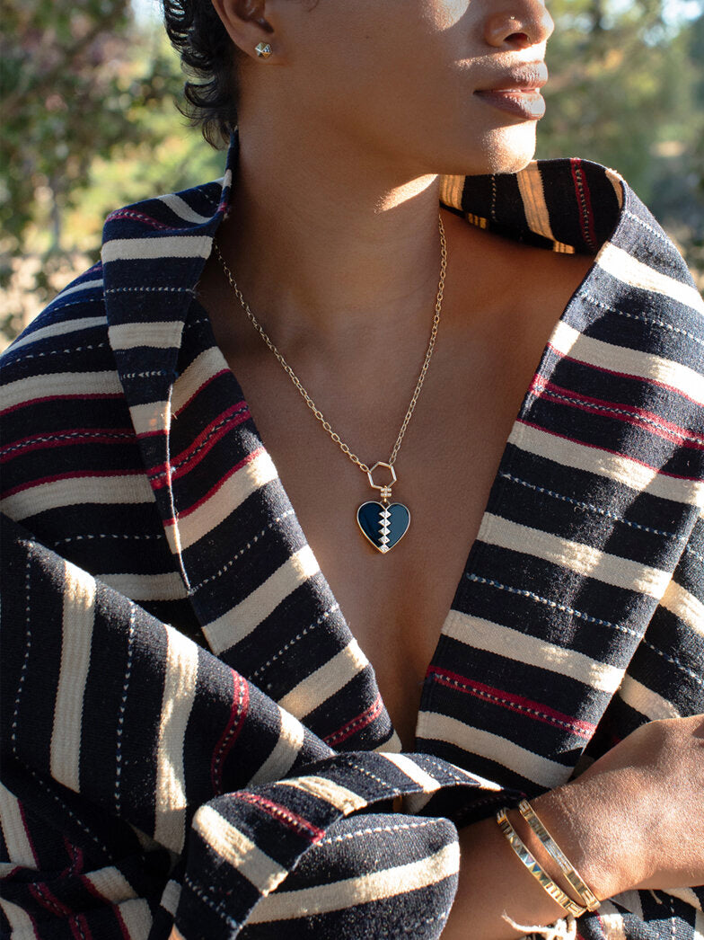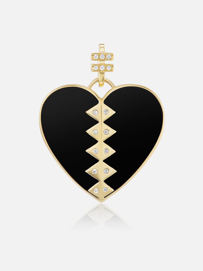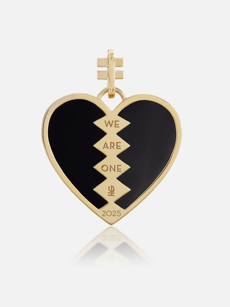 Der Anhänger, der als heilender Talisman gedacht ist, hat in seinem Kern ein Onyxherz. Als Godfrey den Entwurf skizzierte, wurde ihr klar, dass ihr charakteristisches Dreiecksmotiv, das wiederholt über dem Herzen platziert wurde, etwas erzeugte, das wie ein gebrochenes Herz aussieht, das wieder zusammengesetzt wurde. Die Wahl für schwarzen Onyx fiel aus zwei Gründen: Seine Farbe repräsentiert nicht nur die schwarzen Leben, die er ehrt, sondern er soll auch ein Stein der Erdung und Stärke sein. Jedes Herz verfügt über einen Bügel, der sich öffnet und an der markentypischen Foundation-Kette befestigt werden kann. Der Kautionsbügel hat zwei Balken, die ein Symbol der Gleichheit darstellen, als Geste der Einheit, die wir erreichen können, wenn wir uns gegenseitig helfen.