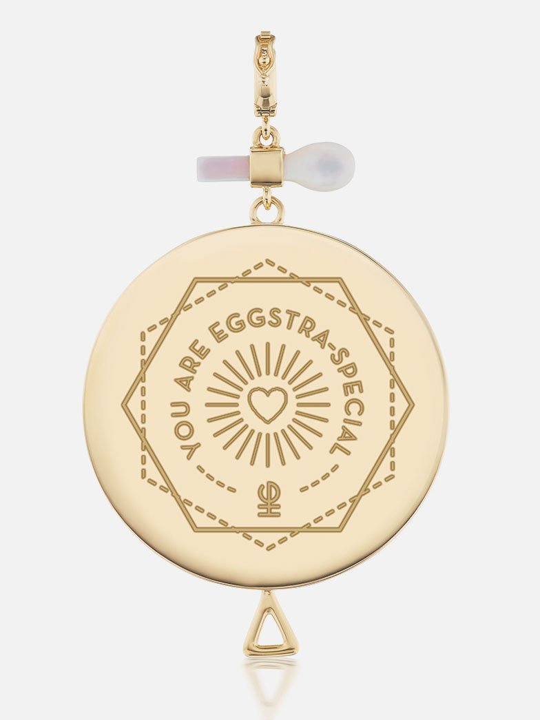 Anhänger aus 18 Karat Gelbgold, braunen und weißen Diamanten mit Perlmuttlöffel und Öse zum Öffnen. Die Detailgravur auf der Rückseite lautet „You are Eggstra-special“.