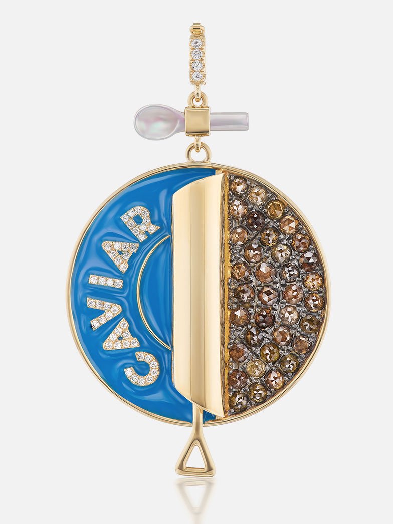 Bei unserem Kaviar-Anhänger, der eines der Lieblingsstücke der Designerin Lauren Harwell Godfrey feiert, kommt es auf die Details an. Von den winzigen Perlmuttlöffeln über die gebogene Golddose bis hin zu den braunen Diamanten zu Ehren ihrer Lieblingssorte, Golden Osetra, ist der Anhänger sowohl in einer traditionellen blauen Emaille- als auch in einer weißen Version erhältlich. Es kann an jede Signatur-Foundation-Kette angehängt werden.
