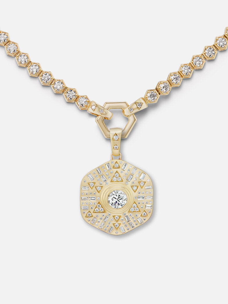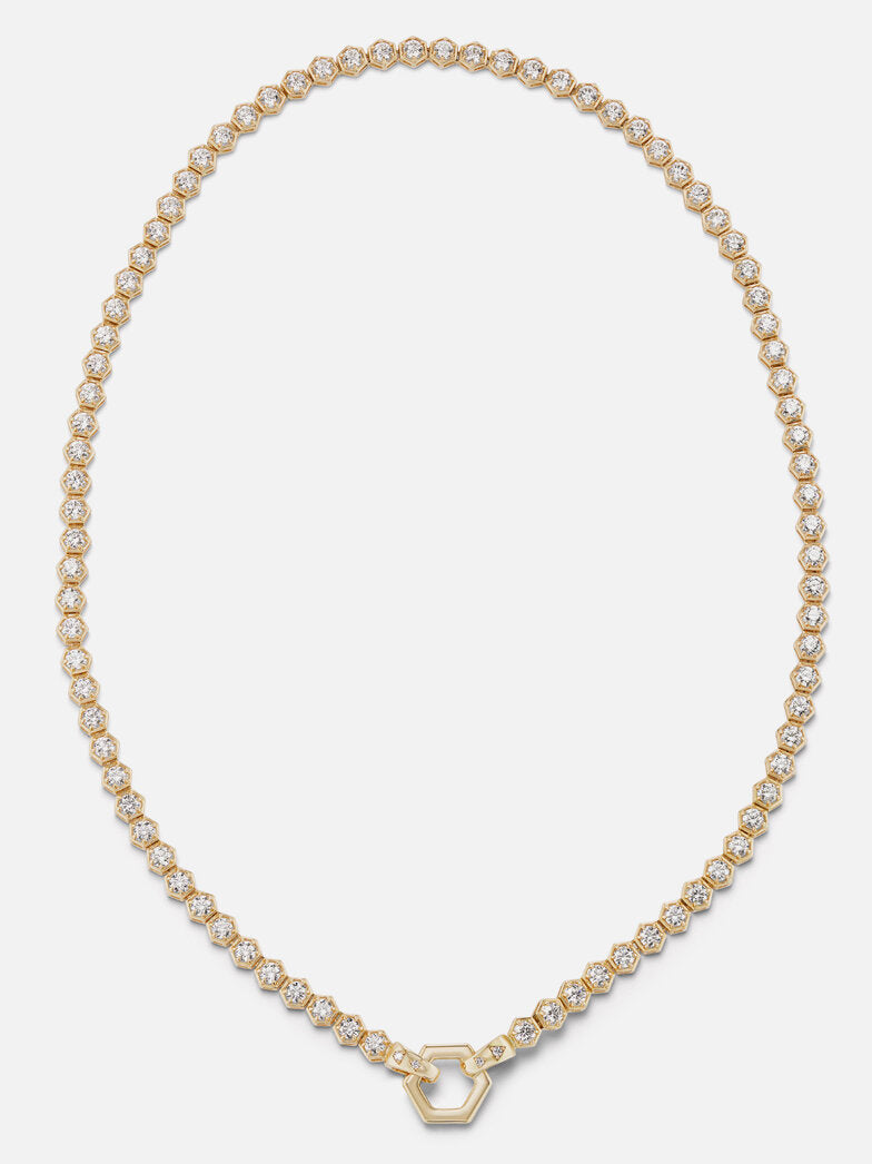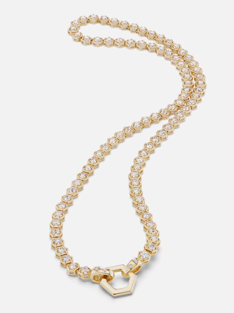 Unsere charakteristische Tennishalskette – eine atemberaubende Reihe sechseckiger, gefasster Steine – ist mit schillernden Diamanten besetzt. Diese Halskette ist an einem Ende vom goldenen Foundation-Verschluss abnehmbar und kann auf vielfältige Weise getragen werden: mit dem Sechseck allein auf der Vorderseite, mit zusätzlichen Anhängern oder auf der Rückseite, damit der Regenbogeneffekt im Mittelpunkt steht.