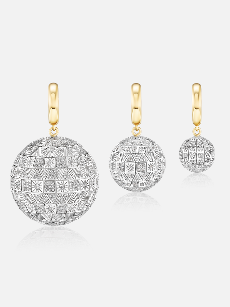 Each piece in the Disco capsule is crafted with my signature design elements: engraved lines, pyramid shapes, and a constellation of sparkling diamonds in varying scales and compositions. The mixed-metal construction—18k yellow gold settings paired with 18k white gold and diamond-studded spheres—marks an exciting new design direction for the brand. And yes, every piece spins—because how could they not?