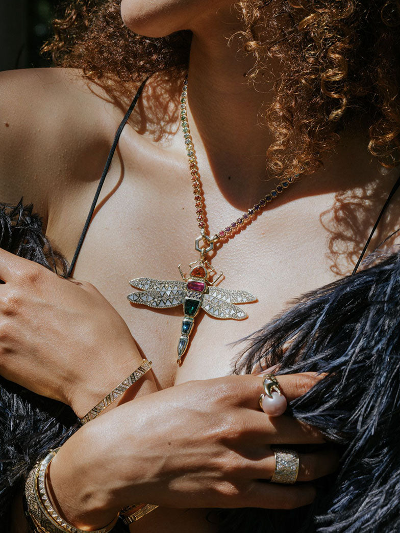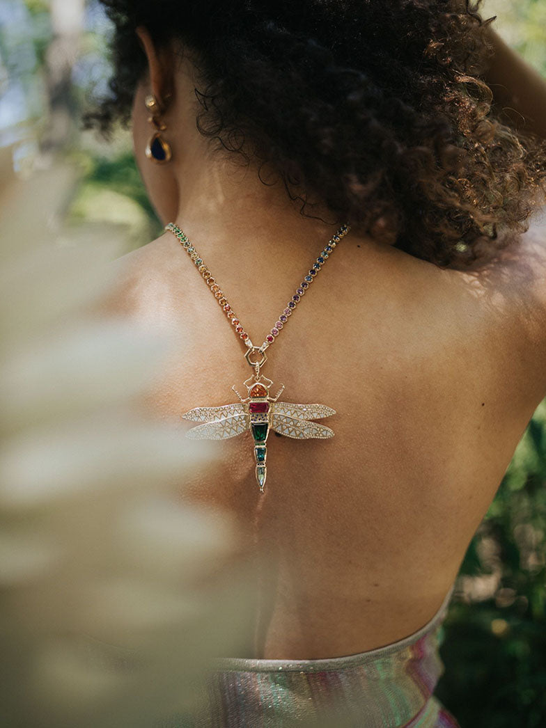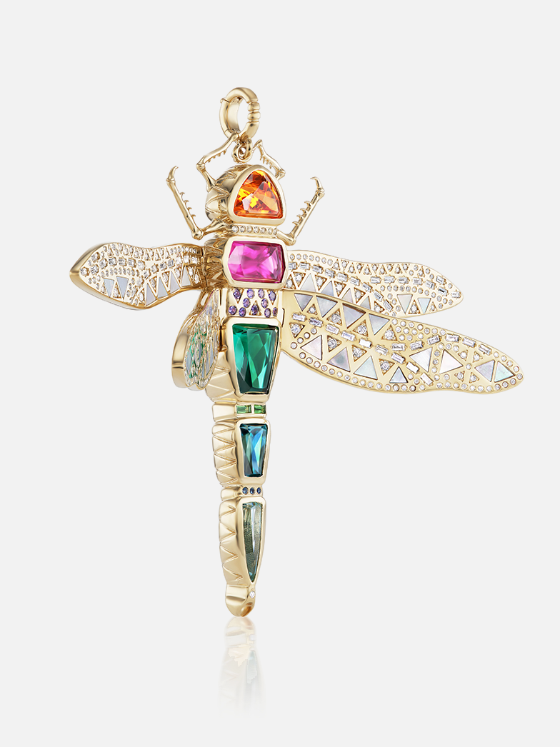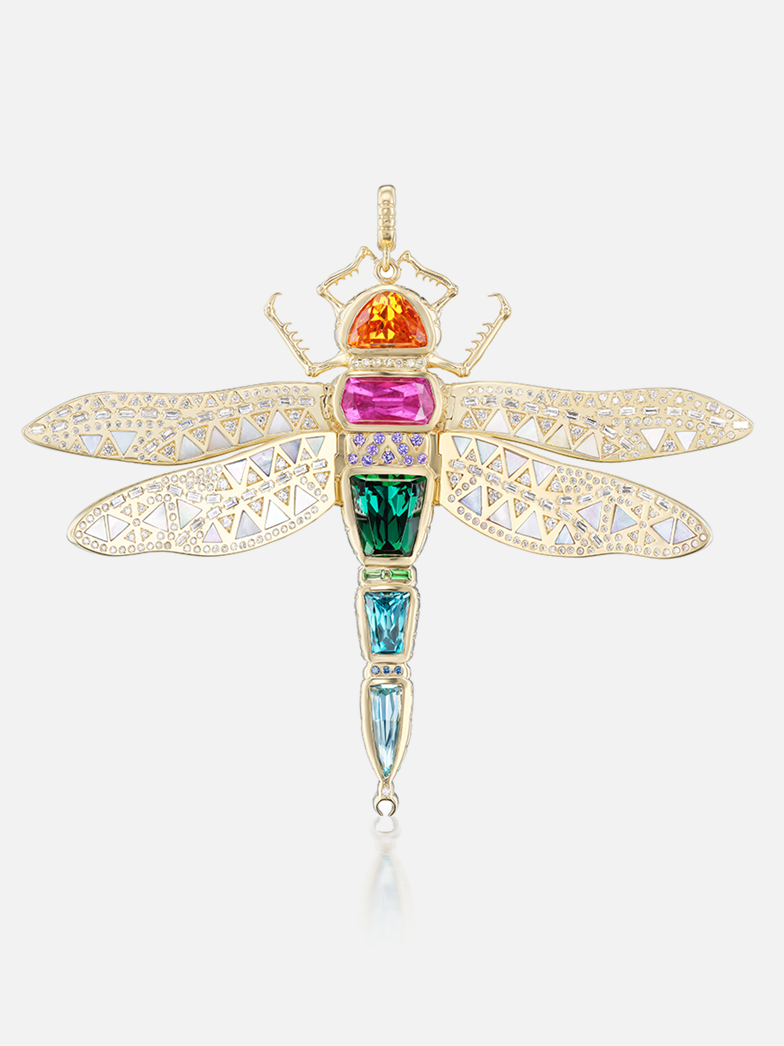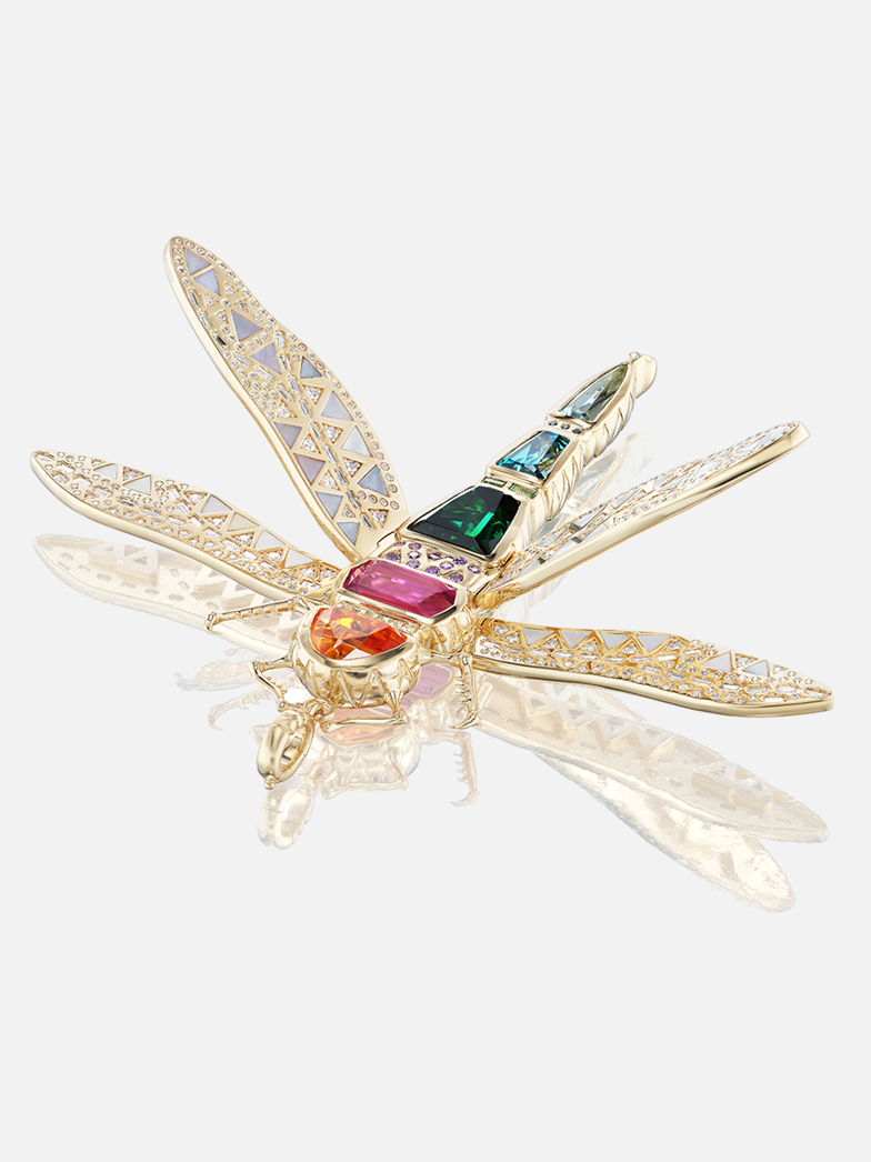 Die satten Farbtöne des Körpers der Libelle stehen für Freiheit und Spontaneität und werden durch bewegliche Flügel aus Perlmutt und Diamanten ausgeglichen.