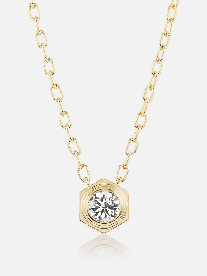 Als moderne Kombination aus hart und weich nimmt Hexed die HG-Klassikerform des Sechsecks auf und kombiniert sie mit konzentrischen Kreisen für eine dreidimensionale Fassung, die stark von kräftigem Gelbgold geprägt ist. Erhältlich als Halskette mit Anhänger, Ohrstecker oder Ring, kombinierbar!