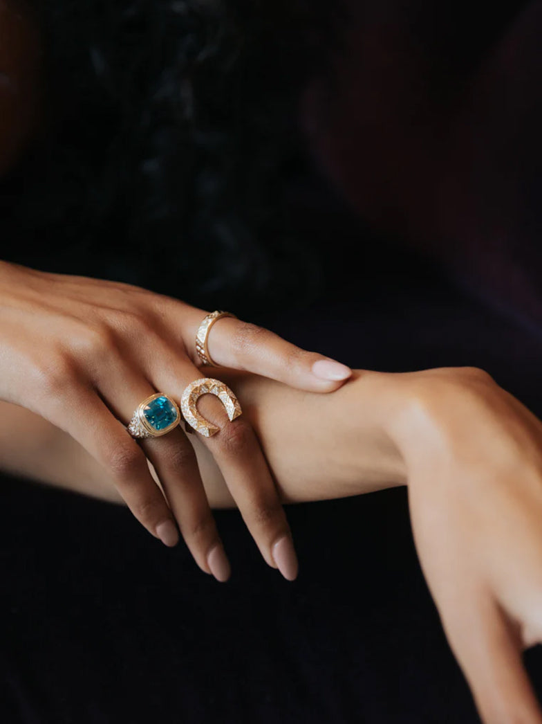 Brauchen Sie ein bisschen Glück auf Ihrer Seite? Unser kleines Hufeisen ist Laurens Ode an eine ihrer Kindheitsleidenschaften: Reiten. Der Legende nach lässt das Tragen eines Hufeisens mit der Vorderseite nach unten Glück ausströmen – und brauchen wir heutzutage nicht alle ein wenig Schutz?