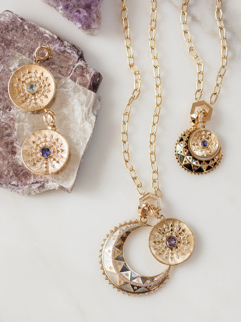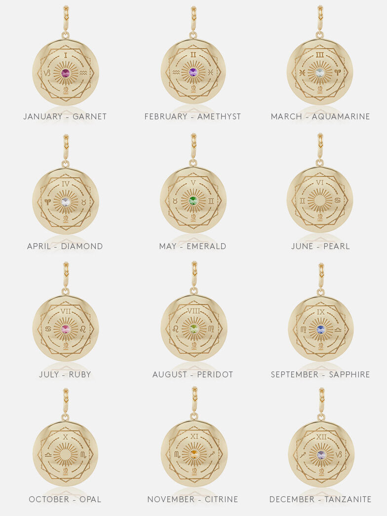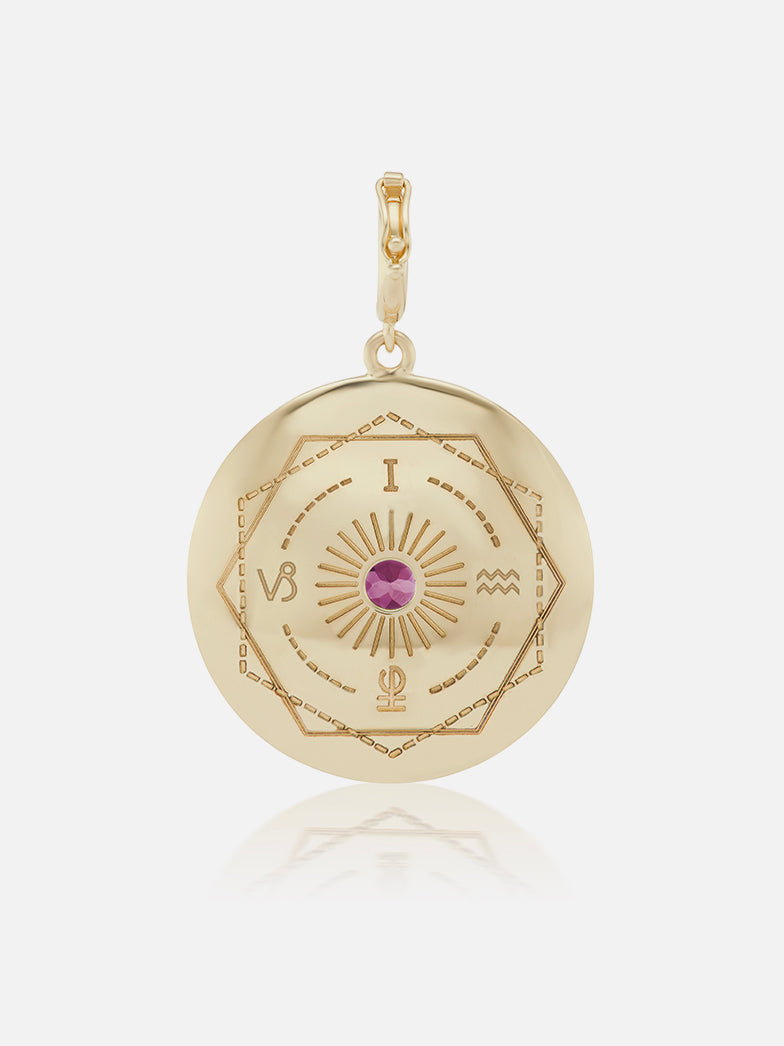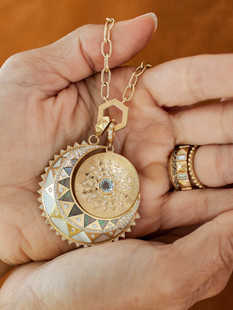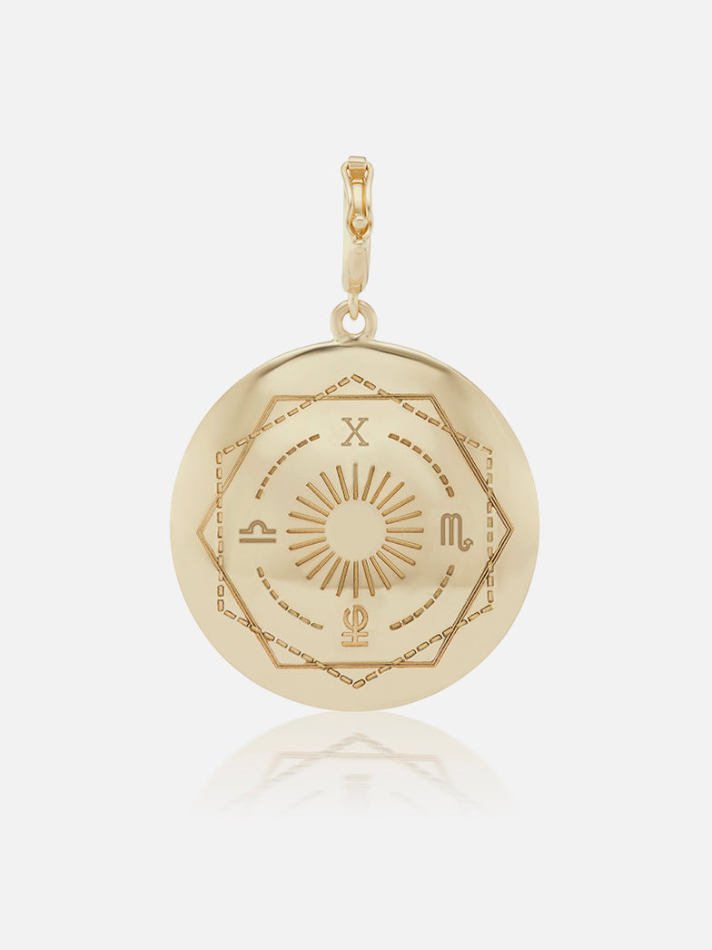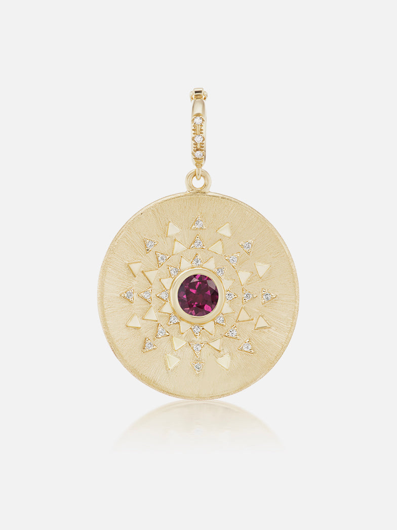 Diese reichhaltigen Scheiben aus 18-karätigem Gold sind eine unverzichtbare Ergänzung zu Ihrem HG Moon-Anhänger (ja, er lässt sich mühelos zusammenstecken!) oder ein atemberaubendes Einzelstück. Sie sind mit den charakteristischen HG-Dreiecken verziert, die strahlenförmig von einem schillernden Mittelstein ausgehen. Erhältlich in zwei Größen – Major und Mini – werden unsere neuen Lieblings-Talismane in jedem Geburtsstein in Kombination mit Pavé-Diamantstrahlen angeboten. Wie bei den meisten HG-Stücken können Sie jedes Medaillon umdrehen, um einen zusätzlichen Bonus zu erhalten: komplizierte Gravuren, die dem Mittelstein der Sonne entsprechen. Ein abnehmbarer Verstärker ermöglicht es Ihnen, ihn jederzeit an- und abzunehmen, wenn Sie etwas mehr Licht in Ihrem Leben benötigen.