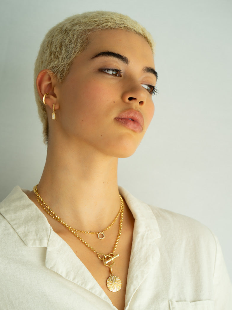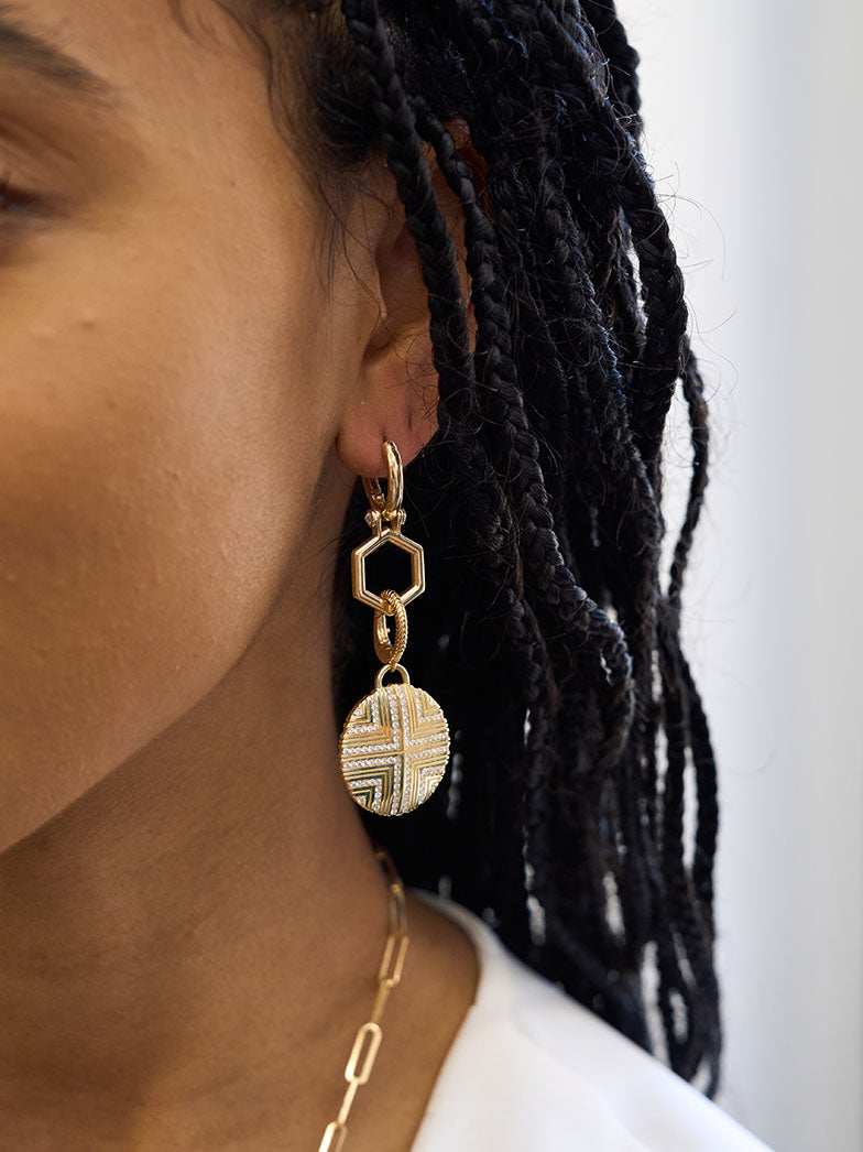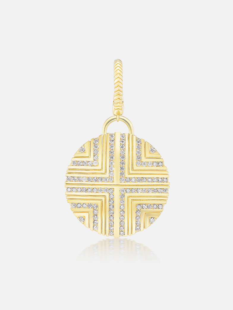 18k yellow gold masego mini knife edge medallion with diamond details.