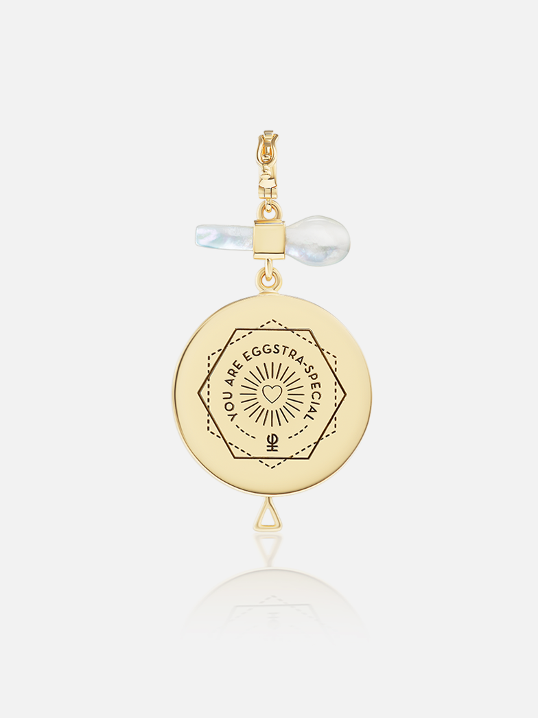 Mini-Kaviaranhänger aus 18 Karat Gelbgold mit braunen und weißen Diamanten, einem Perlmuttlöffel und einer Öse zum Öffnen. Die Detailgravur auf der Rückseite lautet „You are Eggstra-special“.