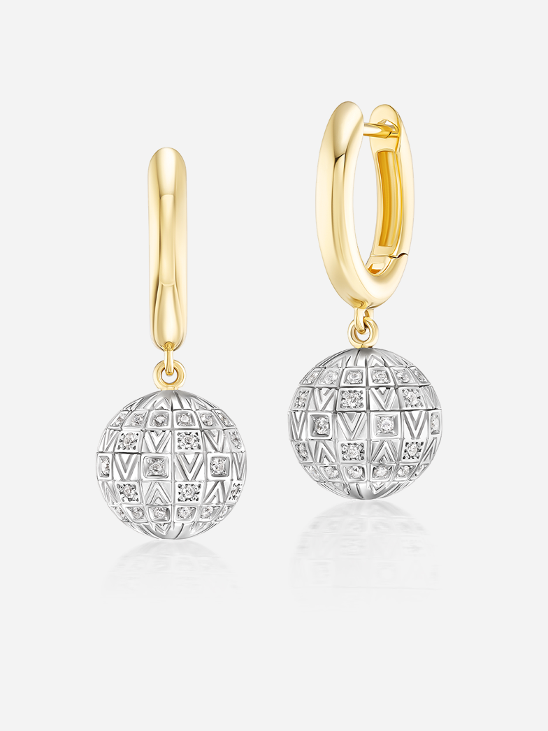 Each piece in the Disco capsule is crafted with my signature design elements: engraved lines, pyramid shapes, and a constellation of sparkling diamonds in varying scales and compositions. The mixed-metal construction—18k yellow gold settings paired with 18k white gold and diamond-studded spheres—marks an exciting new design direction for the brand. And yes, every piece spins—because how could they not?