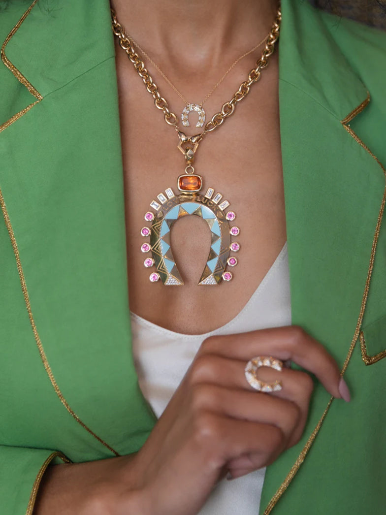 Brauchen Sie ein bisschen Glück auf Ihrer Seite? Unser kleines Hufeisen ist Laurens Ode an eine ihrer Kindheitsleidenschaften: Reiten. Der Legende nach lässt das Tragen eines Hufeisens mit der Vorderseite nach unten Glück ausströmen – und brauchen wir heutzutage nicht alle ein wenig Schutz?