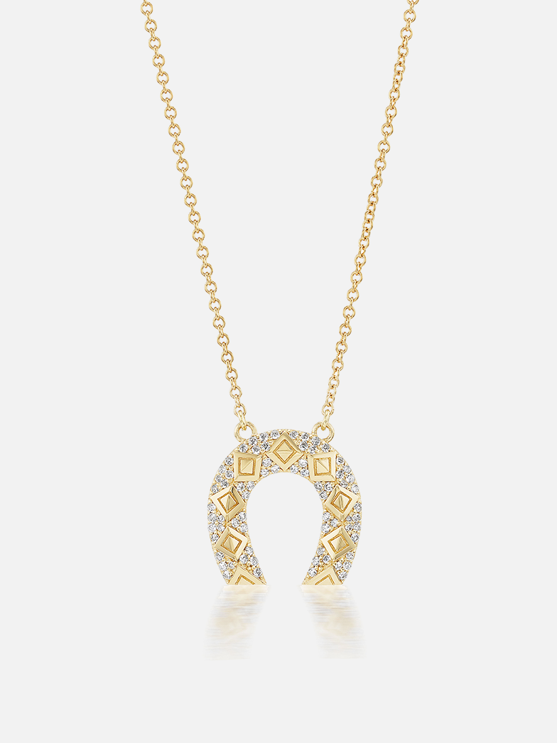 16-18" längenverstellbare Mini-Hufeisen-Halskette aus 18 Karat Gelbgold mit Pavé-Diamanten mit erhabenen Dreiecksdetails. Love + Luck-Gravurdetail auf der Rückseite.