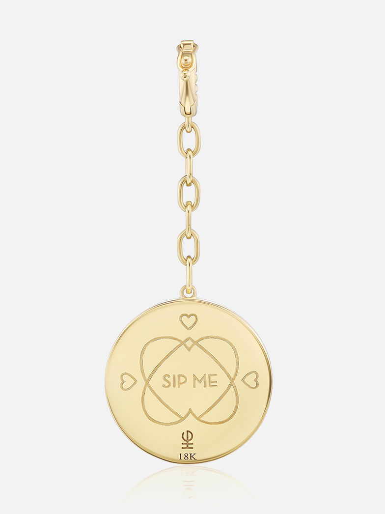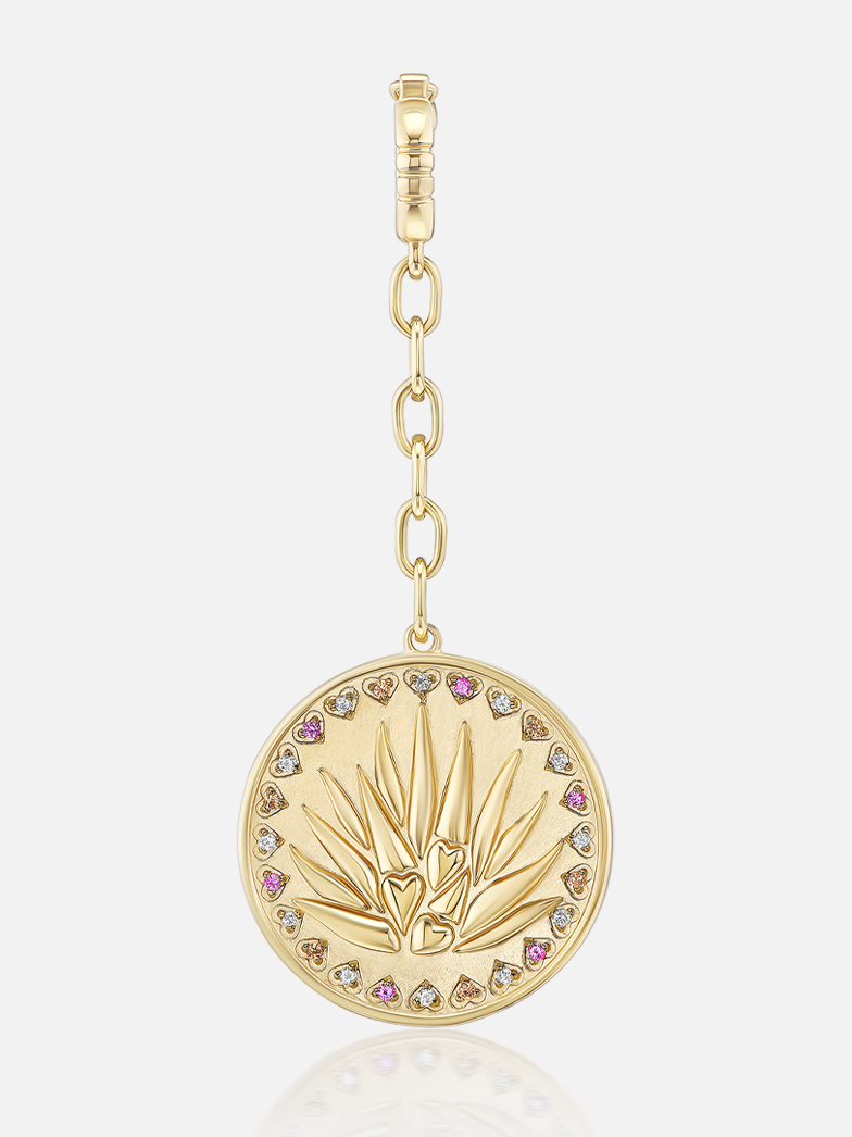 18 Karat Gelbgold Agavenmedaillon mit einem aus Diamanten und einem Saphirherz ausgeschnittenen Rand, der mit „Sip Me“ gekennzeichnet ist.