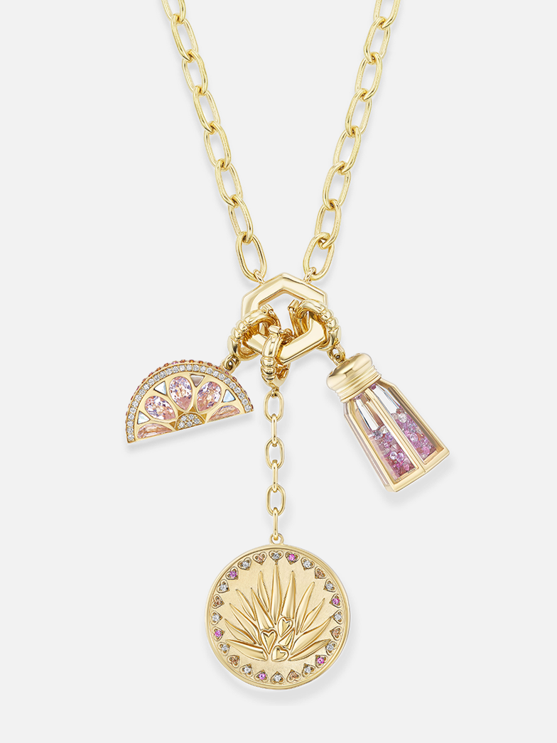 Zu Ehren ihrer Hingabe an den Agavengeist entwarf Lauren ein Charm-Set aus 18 Karat Gold mit frechen Gravuren. Auf einer saftigen Grapefruitscheibe aus Saphir, Perlmutt, Diamant und Morganit steht „Squeeze Me“, auf einem Salzstreuer aus Bergkristall, gefüllt mit funkelndem Diamant- und Saphirsalz, auf dem „Lick Me“ steht, und auf einem Agavenmedaillon mit einem Herzen aus Diamant und Saphir Schneiden Sie einen Rand mit der Aufschrift „Sip Me“ aus.