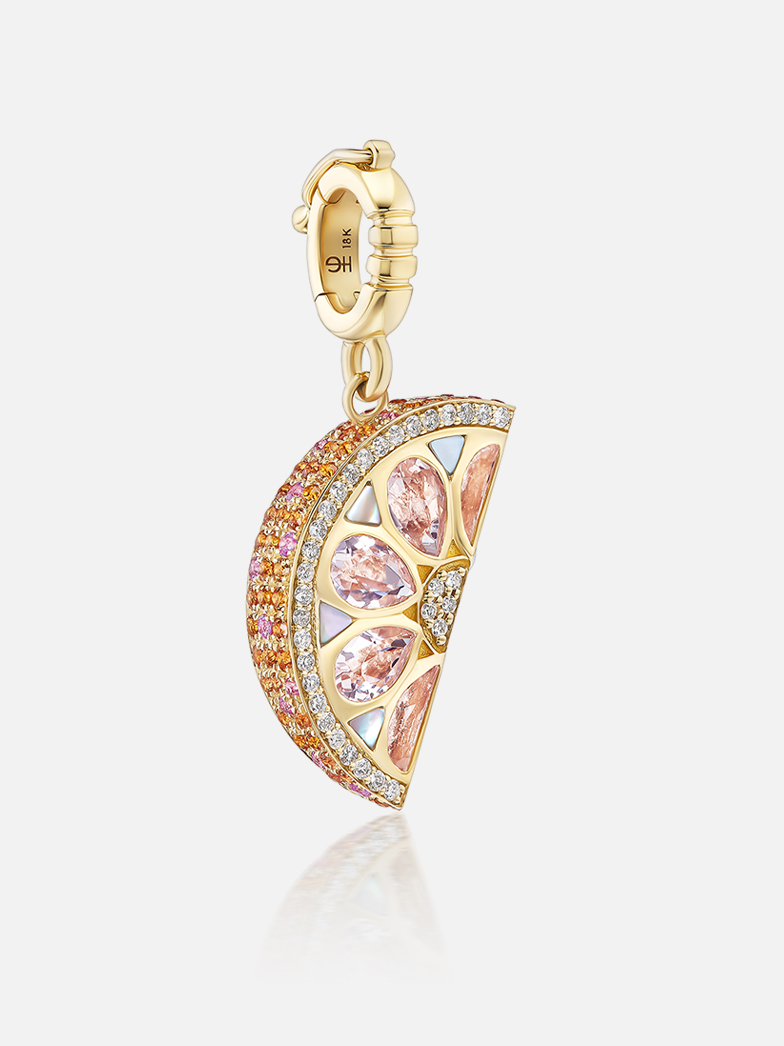 Saftiger Keilanhänger aus 18 Karat Gelbgold mit Saphir, Perlmutt, Diamant und Morganit-Grapefruit mit der Aufschrift „Squeeze Me“.