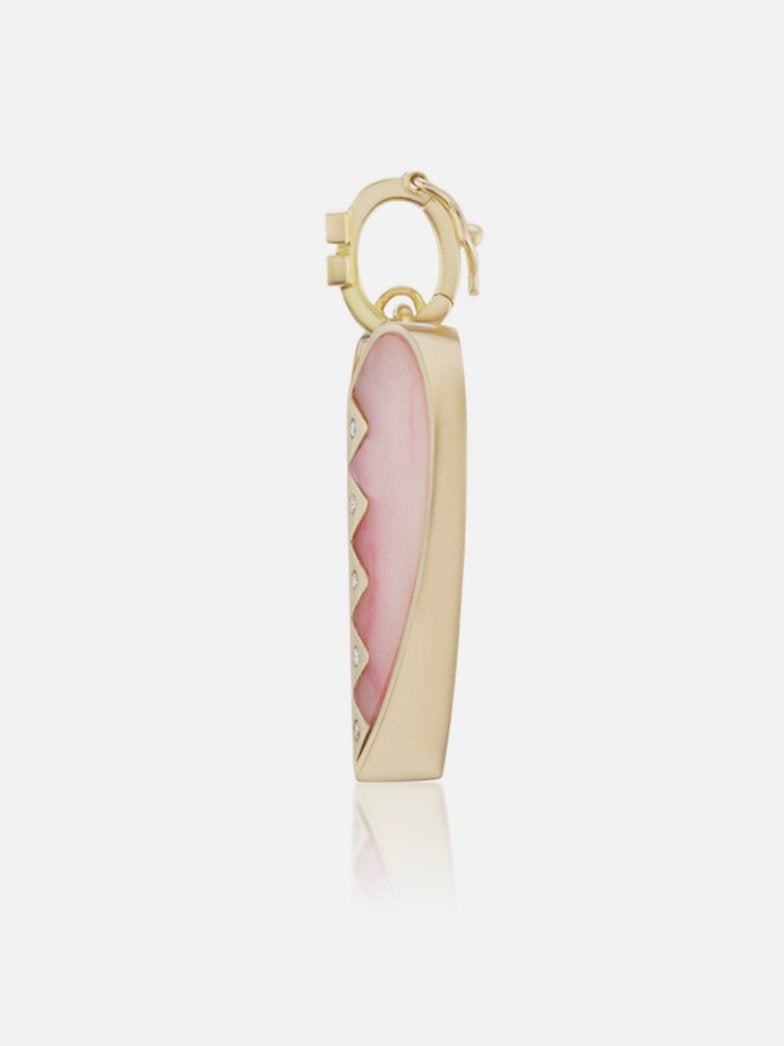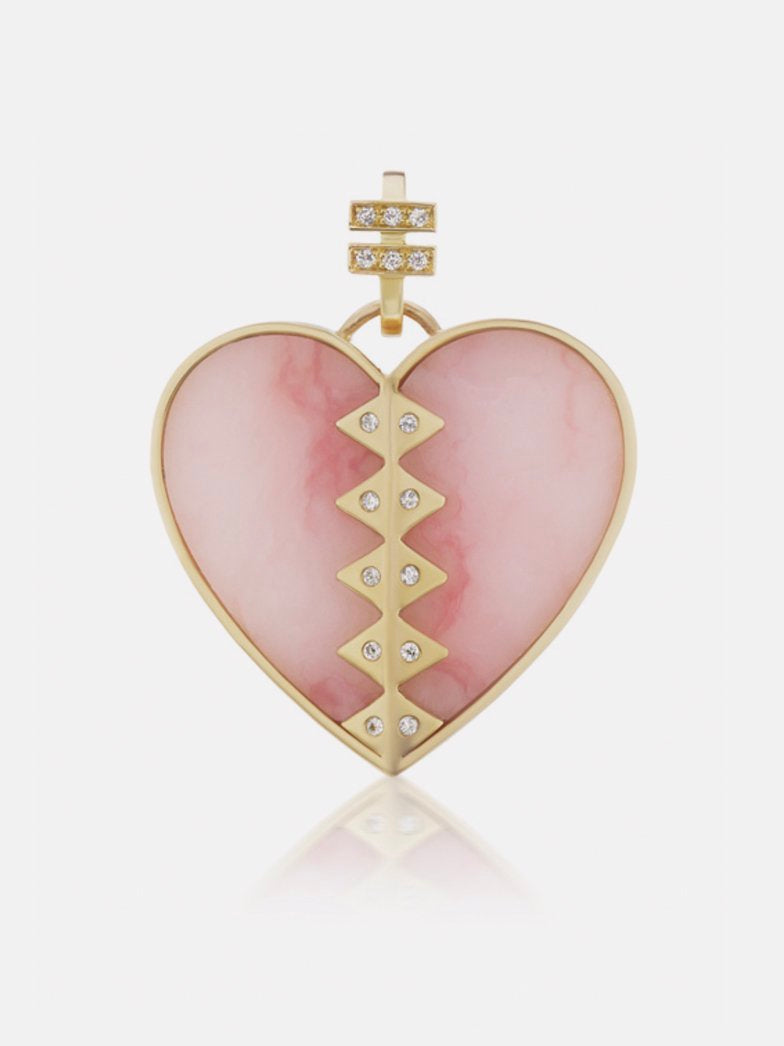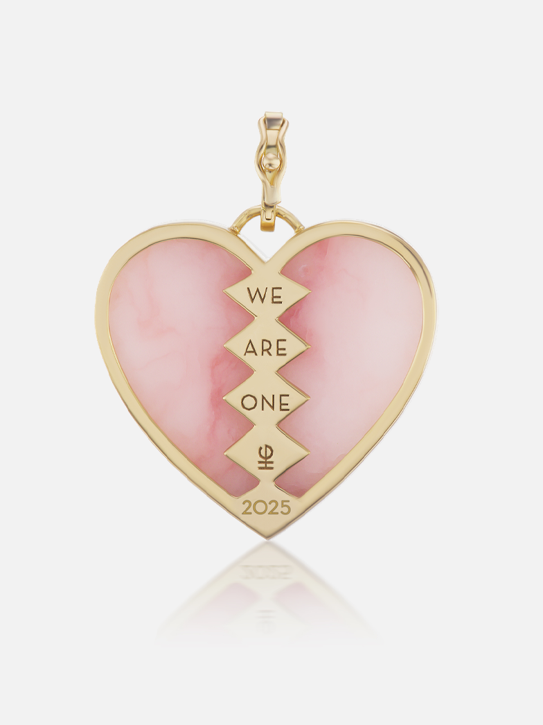 Der Anhänger, der als heilender Talisman gedacht ist, besteht im Kern aus rosafarbenem Opal. Als Lauren den Entwurf skizzierte, wurde ihr klar, dass ihr charakteristisches Dreiecksmotiv, das wiederholt über dem Herzen platziert wurde, etwas erzeugte, das wie ein gebrochenes Herz aussieht, das wieder zusammengesetzt wurde. Die Wahl des Steins ist symbolisch: Pink Opal ist ein Liebesstein mit einer tiefen Verbindung zum Herzchakra. Es heilt unsere Emotionen und ermöglicht es unserem Herzen, sich der Liebe zu öffnen. Jedes Herz verfügt über einen Bügel, der sich öffnet und an der markentypischen Foundation-Kette befestigt werden kann. Der Kautionsbügel hat zwei Balken, die ein Symbol der Gleichheit darstellen, als Geste der Einheit, die wir erreichen können, wenn wir uns gegenseitig helfen.