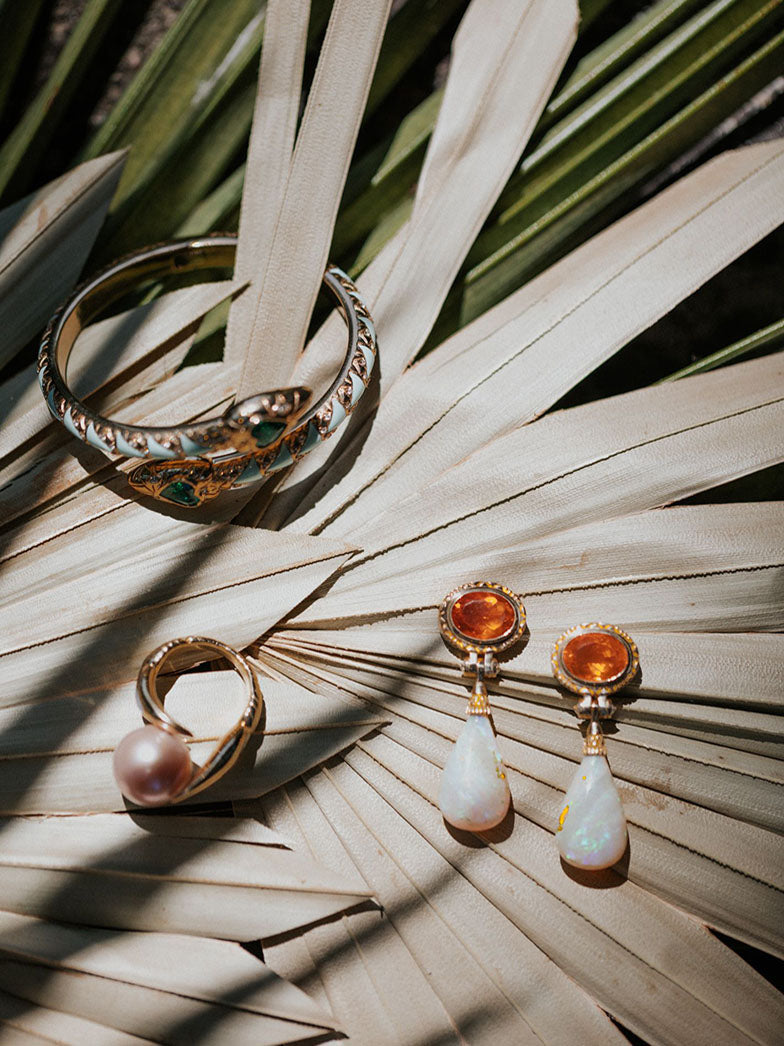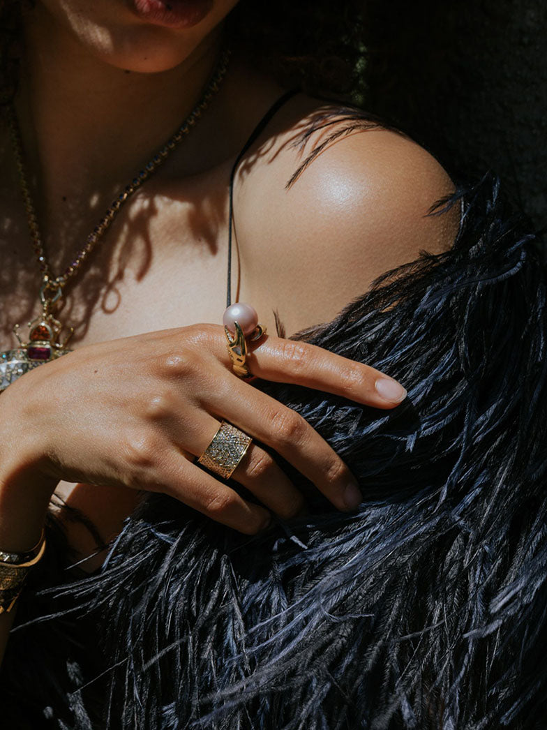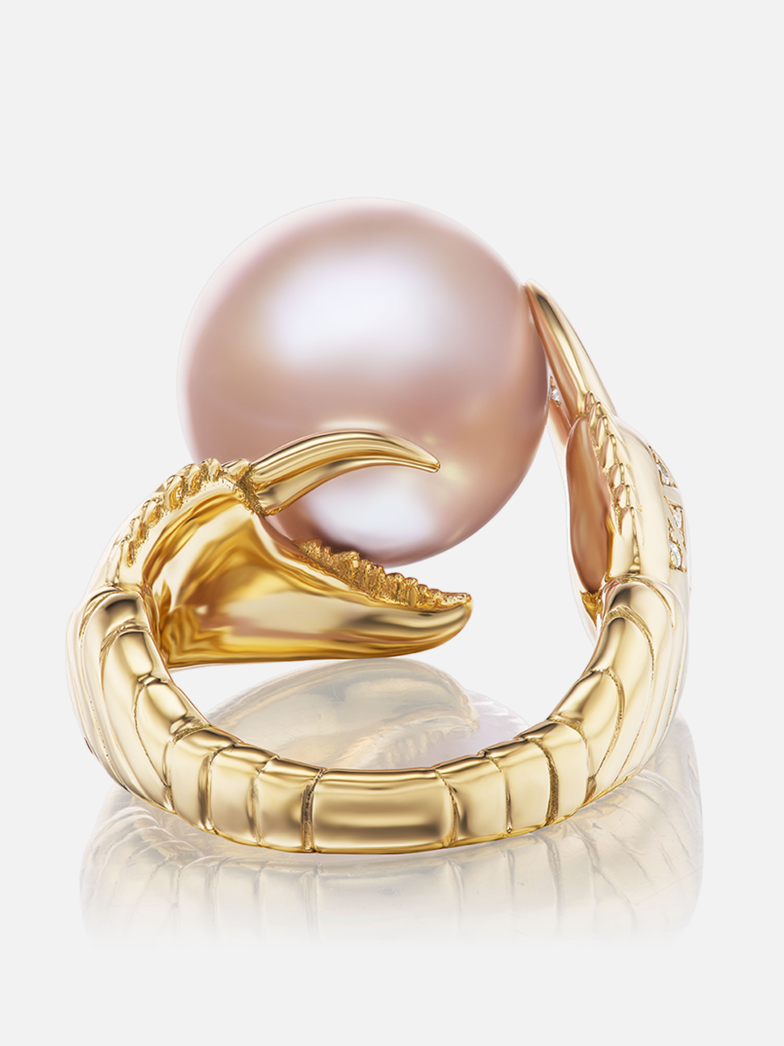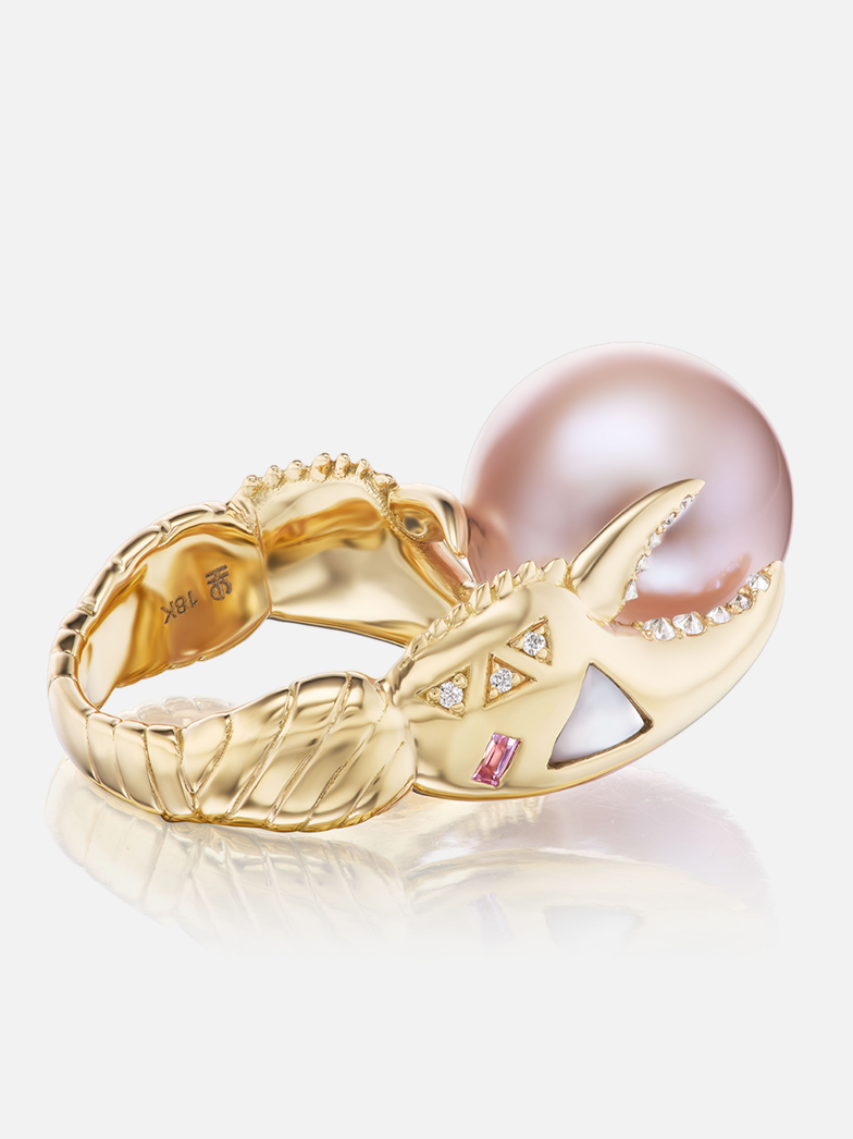 Der Claw-Ring symbolisiert Schutz und Wohlstand und ist so konstruiert, dass er eine einzelne üppige Perle trägt – entweder Süßwasserrosa oder graue Tahitiperle – und anschließend mit Intarsien und Edelsteindetails verziert wird, darunter umgekehrte Diamanten, die die Zangen säumen.