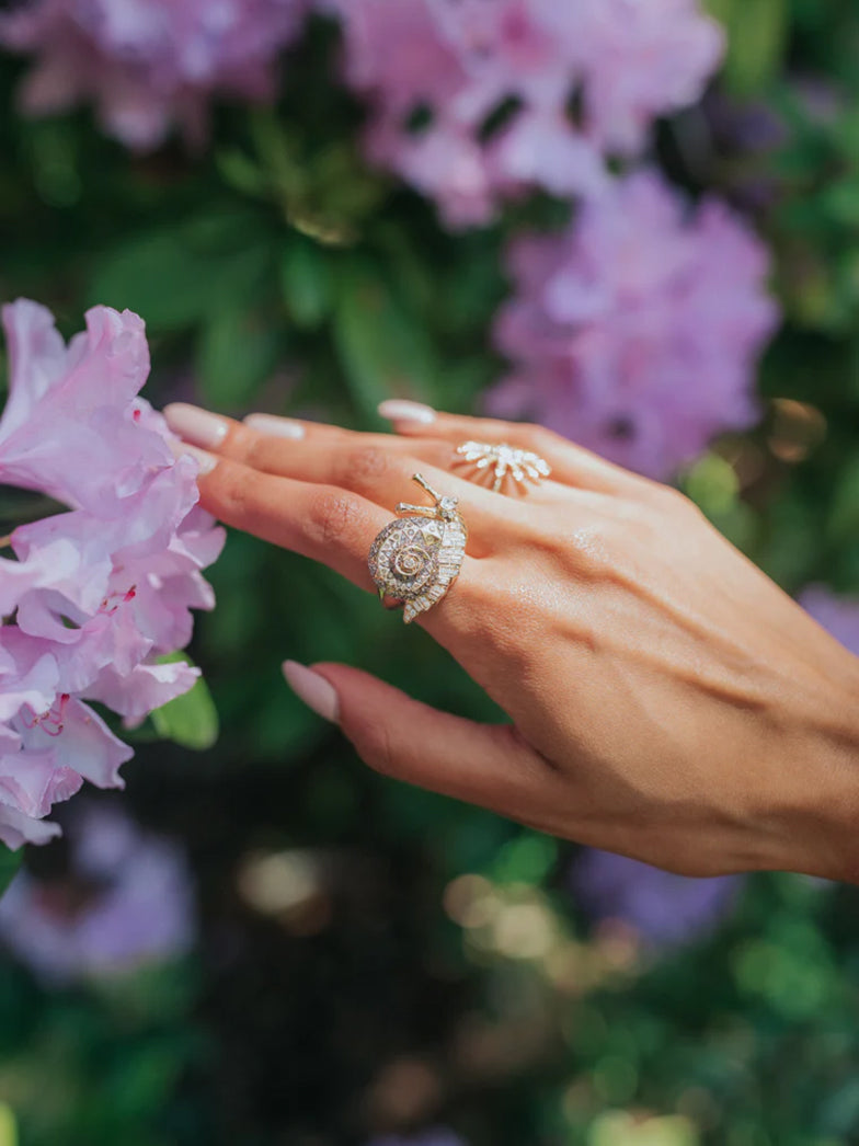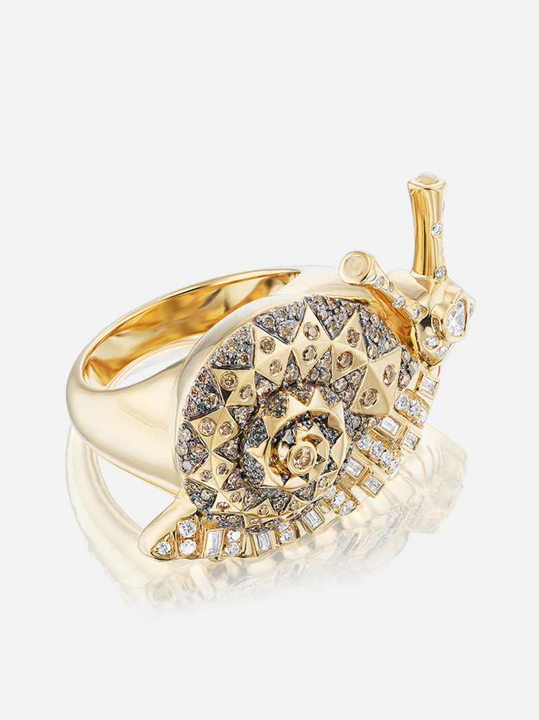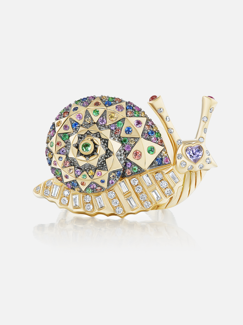 Der schillernde Regenbogenschneckenring aus 18 Karat Gelbgold steht für Geduld und Ausdauer und ist mit einer Vielzahl von Tsavoriten, Saphiren, Amethysten und Diamanten besetzt.