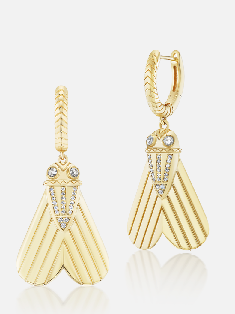 Inspiriert von den Reisen unserer Gründerin Lauren Harwell Godfrey nach Ägypten. Laut Godfrey „entstand diese Fliegen-Minikapsel, nachdem wir von der ganzen Symbolik erfahren hatten, die die Fliegen in Ägypten haben.“ Man sagt, dass sie nicht nur ein Symbol des Schutzes seien, sondern dass in der Antike auch goldene Fliegen geschenkt wurden, um Beharrlichkeit und Tapferkeit im Militärdienst zu würdigen. Nachdem ich mehrere antike Stätten besucht und immer wieder Fliegen gesehen hatte, die in den Hieroglyphen einen Ehrenplatz einnahmen, verspürte ich den Drang, diese fleißigen Kreaturen aus edlen Materialien nachzubilden. 18 Karat Gelbgold und Diamanten, darunter facettierte Diamanten im Rosenschliff in den Augen als Anspielung auf die komplexe Geometrie eines Fliegenauges.“