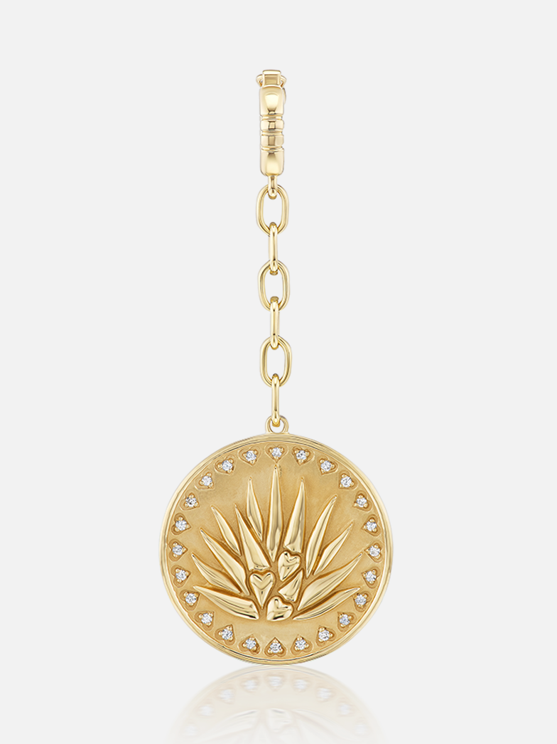 18 Karat Gelbgold Agavenmedaillon mit ausgeschnittenem Diamant-Herzrand und der Aufschrift „Sip Me“.