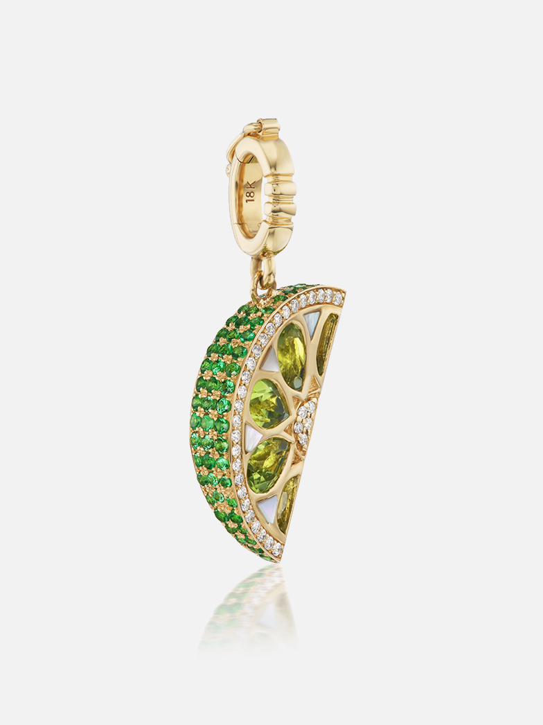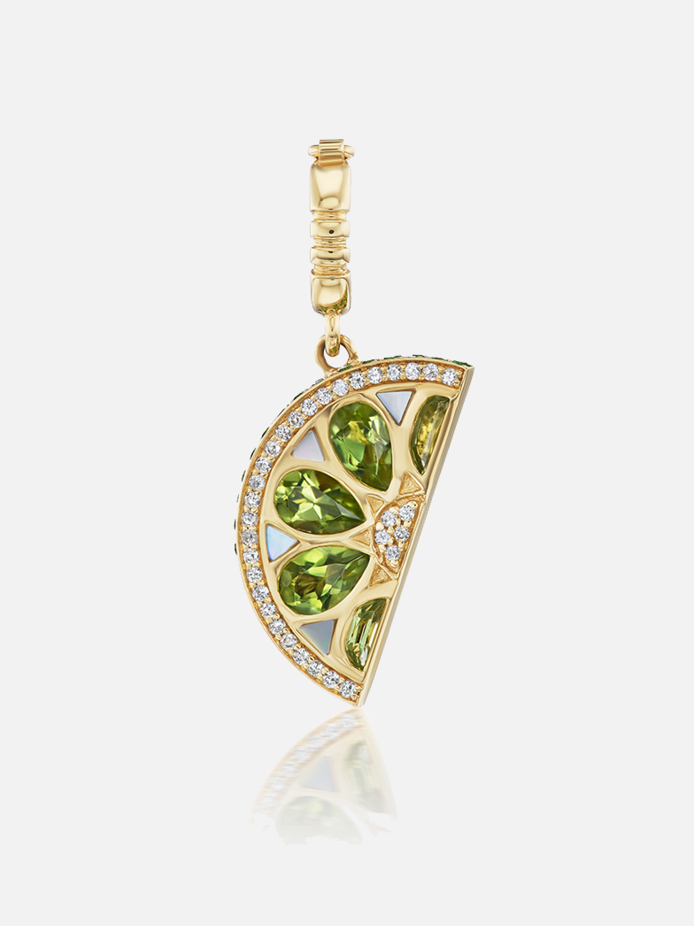Keilanhänger aus saftigem Tsavorit, Perlmutt, Diamant und Peridot aus 18 Karat Gelbgold mit der Aufschrift „Squeeze Me“.