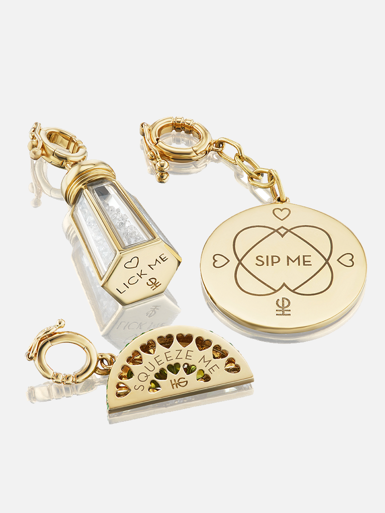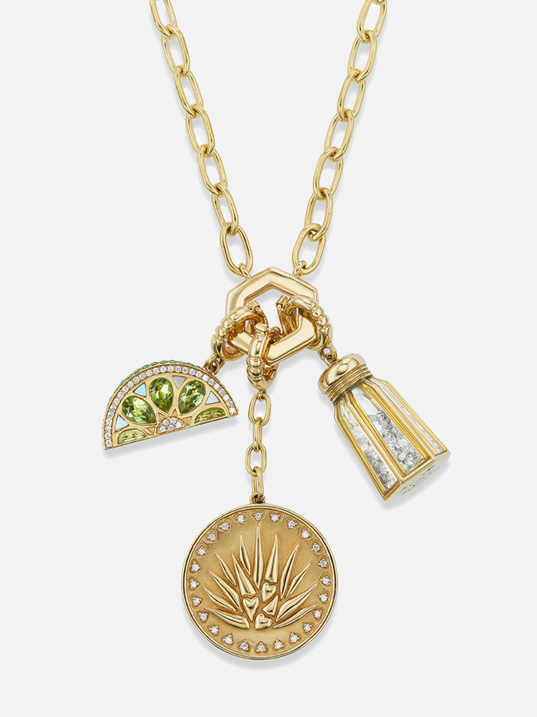 Zu Ehren ihrer Hingabe an den Agavengeist entwarf Lauren ein Charm-Set aus 18 Karat Gold mit frechen Gravuren. Auf einem saftigen Tsavorit-, Perlmutt-, Diamant- und Peridot-Limettenkeil steht „Squeeze Me“, auf einem mit funkelndem Diamantsalz gefüllten Bergkristall-Salzstreuer steht „Lick Me“ und am Rand ein Agavenmedaillon mit einem ausgeschnittenen Diamantherz ist mit „Sip Me“ gekennzeichnet.