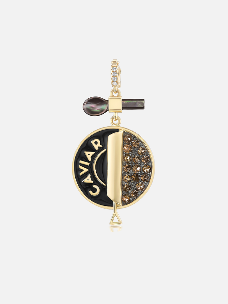 18k yellow gold, brown and white diamond mini caviar pendant with a mother of pearl spoon and a bail that opens. Back detail engraving reads, The Caviar Co. x Harwell Godfrey.