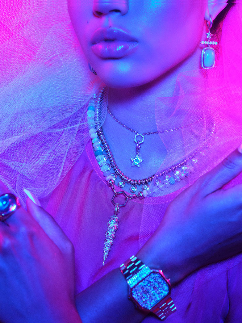 Supernova is a celebration of the magic in the universe. A collection of supernatural and cosmic motifs, including stars, unicorn horns, lucky salt shakers (filled with sparkling gems), a re-envisioned protective evil eye and a very special bracelet that reads as a timepiece forever stuck at 11:11. Containing talismans that invoke kismet and good vibes, Supernova summons you to close your eyes and make a wish.