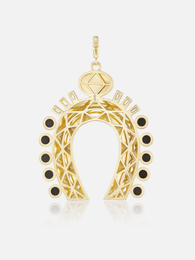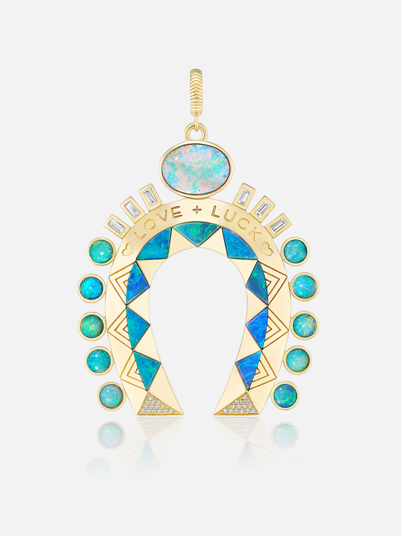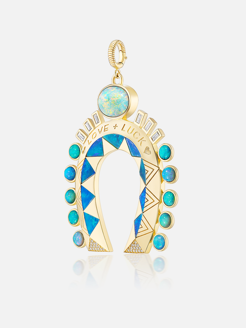 Uncommon Gem: 18k yellow gold XL horseshoe pendant with a center Australian opal 5.05ct, diamonds 1.17ct
