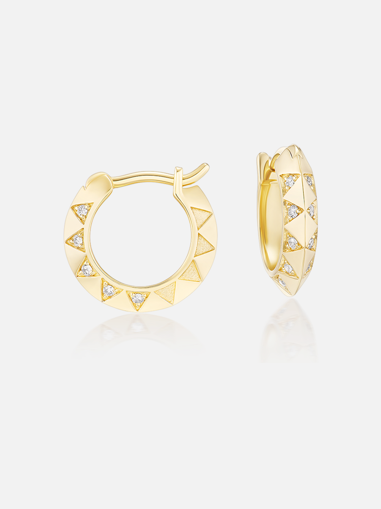 Fine lines and repetition in detail are key components of the hoop collection. Diamonds sit securely in triangle settings, offset for maximum shine and sparkle. Understated scale and delicate in silhouette, these classic hoops will never go out of style.
