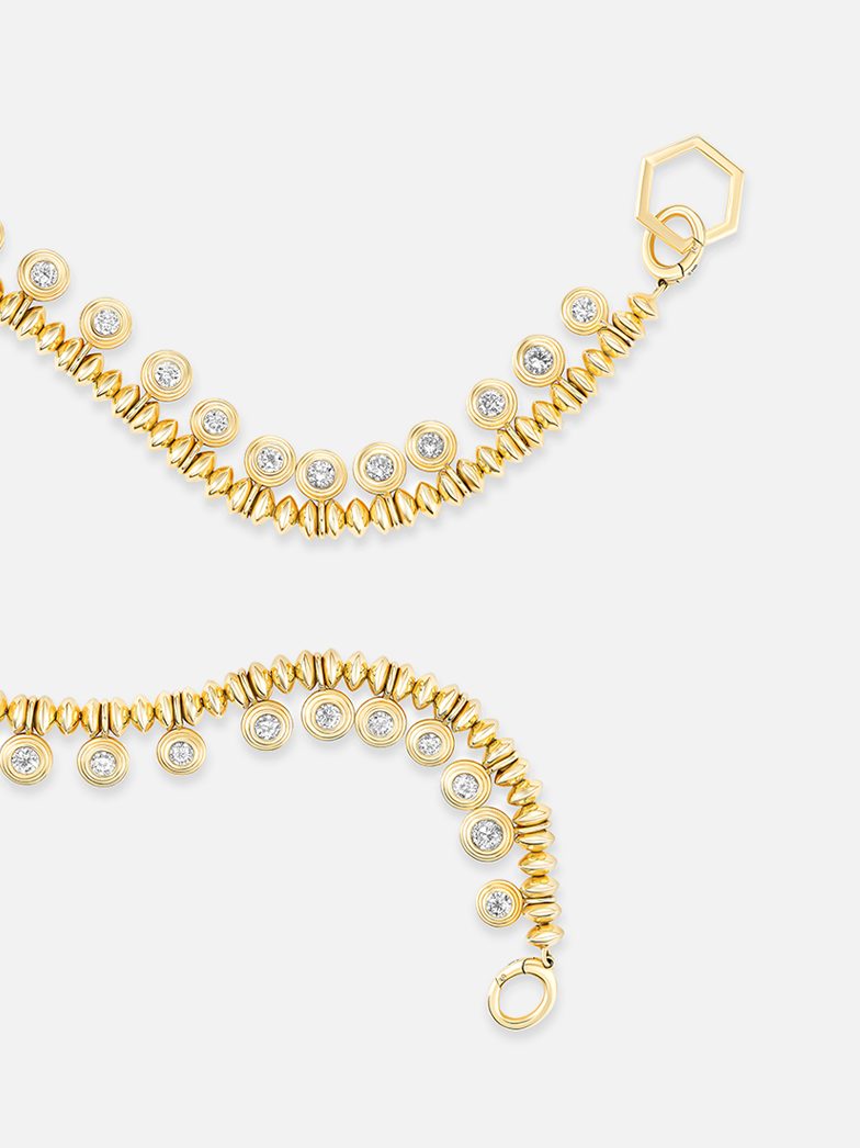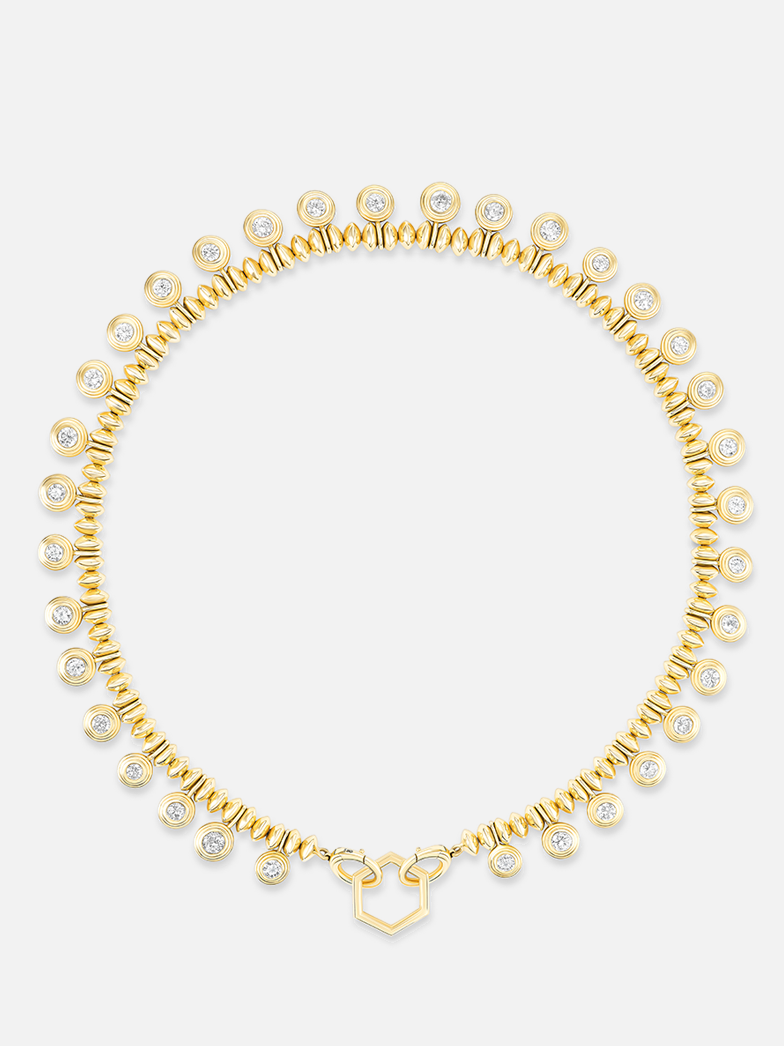 18k yellow gold knife edge bead and diamond bezel charm foundation necklace. Detachable plain gold hexagon bail. Mix and match with other bails.