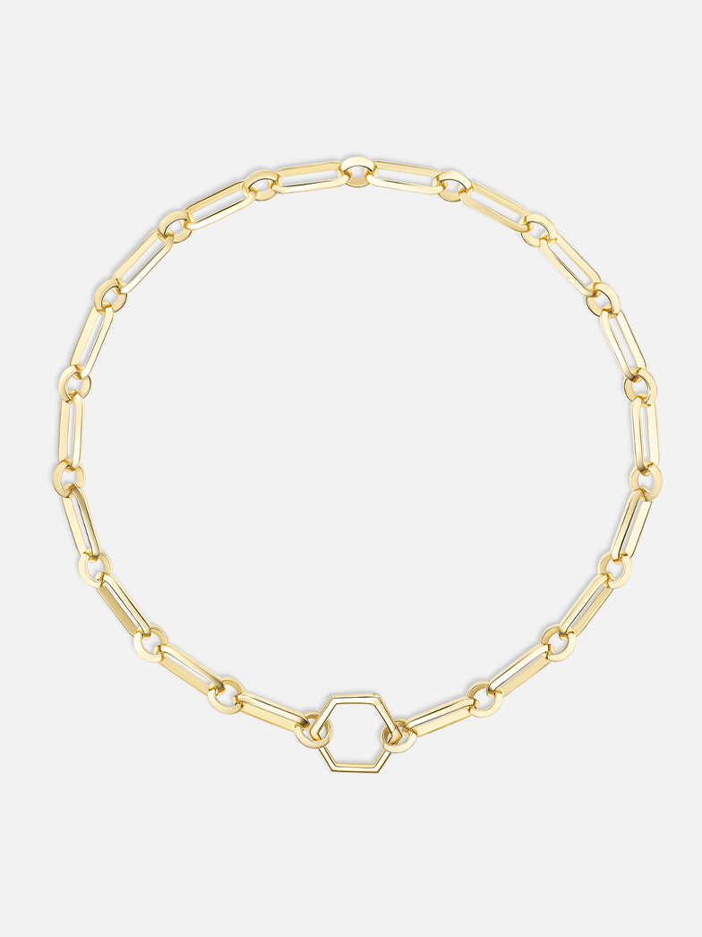 18k yellow gold major knife edge link chain necklace with a spring hinge hexagon foundation, designed to be worn with signature open bail pendants.