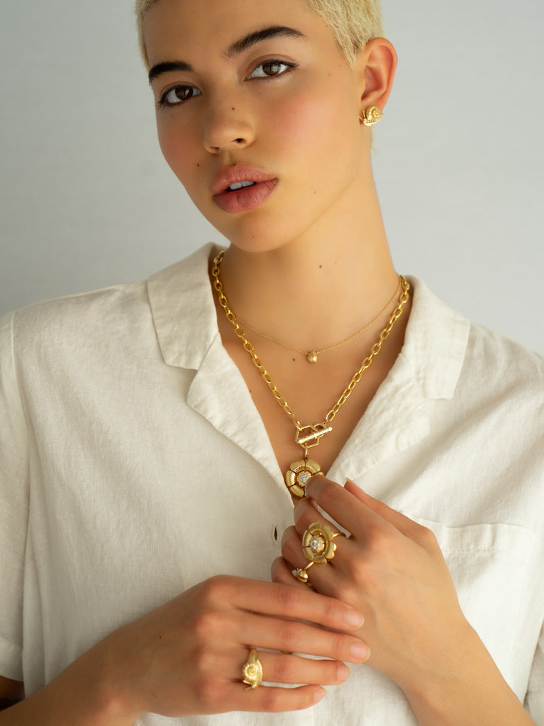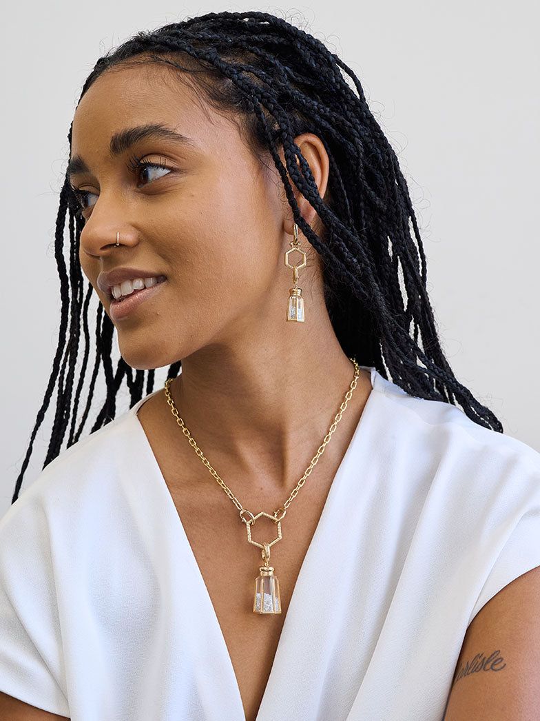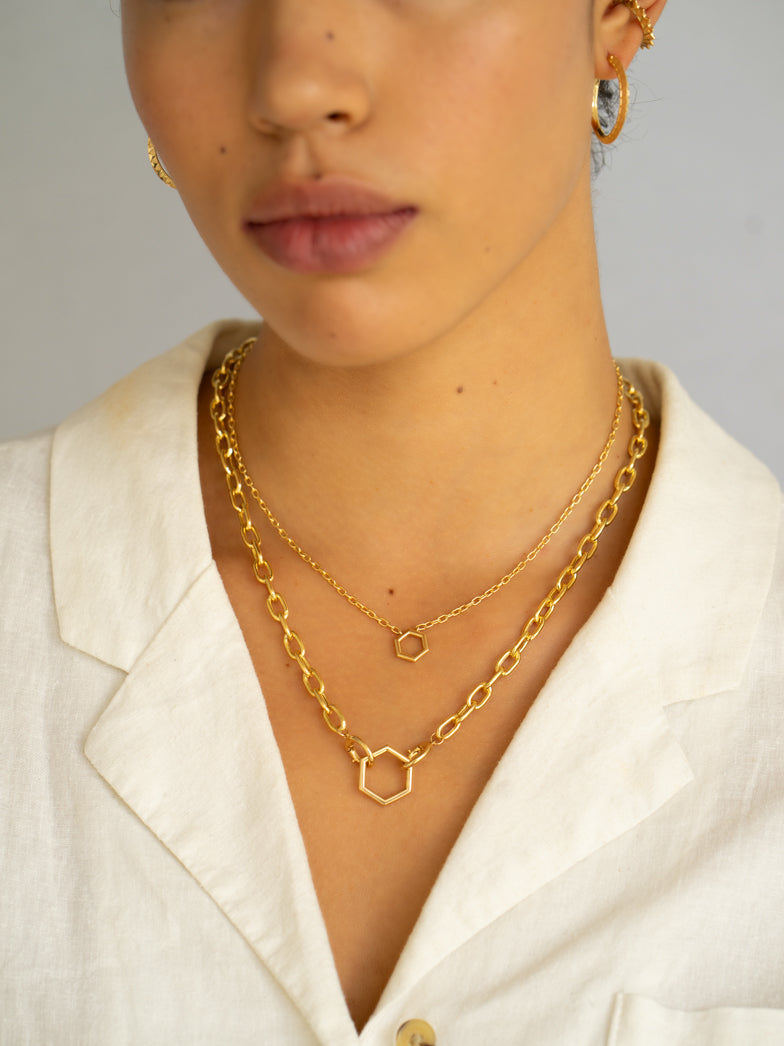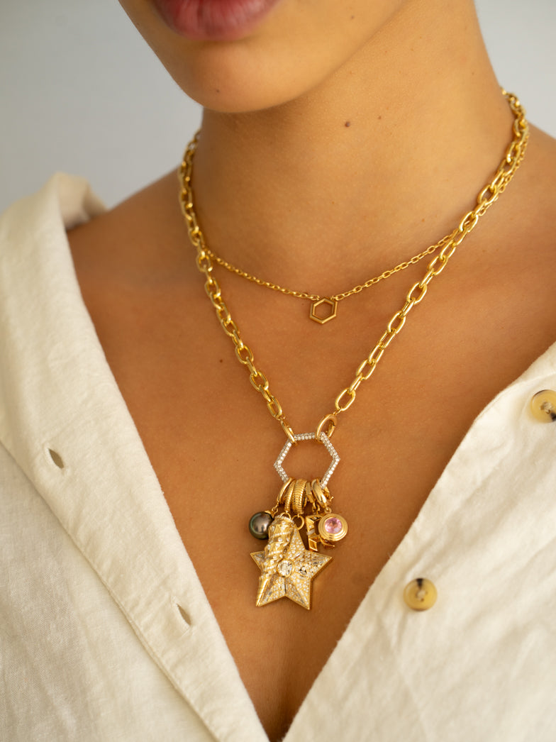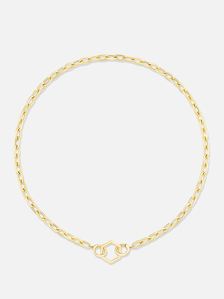 18k yellow gold open bail foundation chain necklace with a detachable hexagon, designed to be worn with signature open bail pendants.