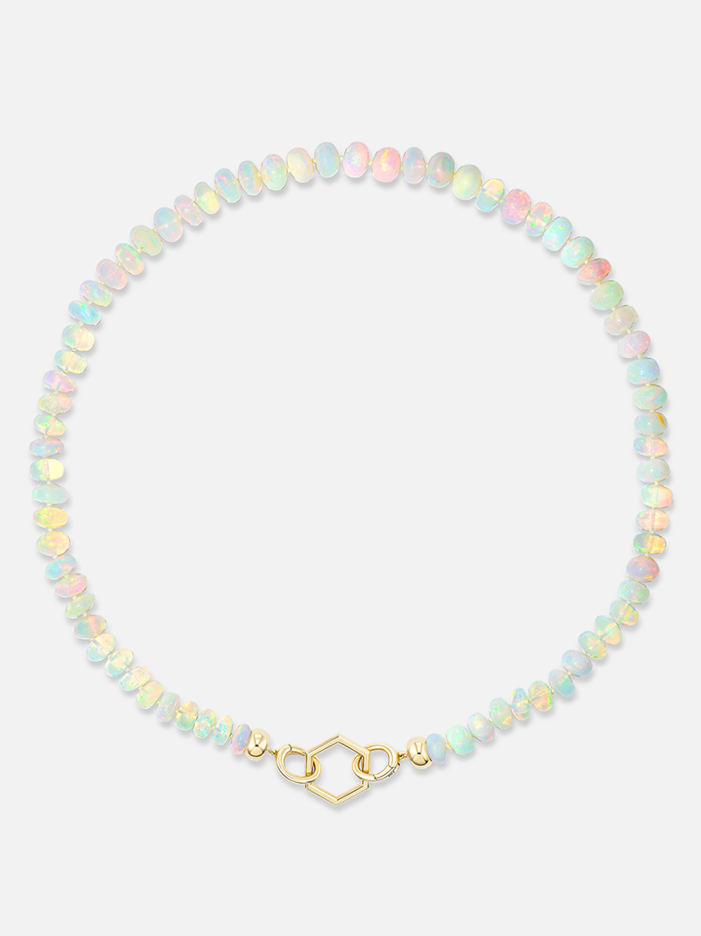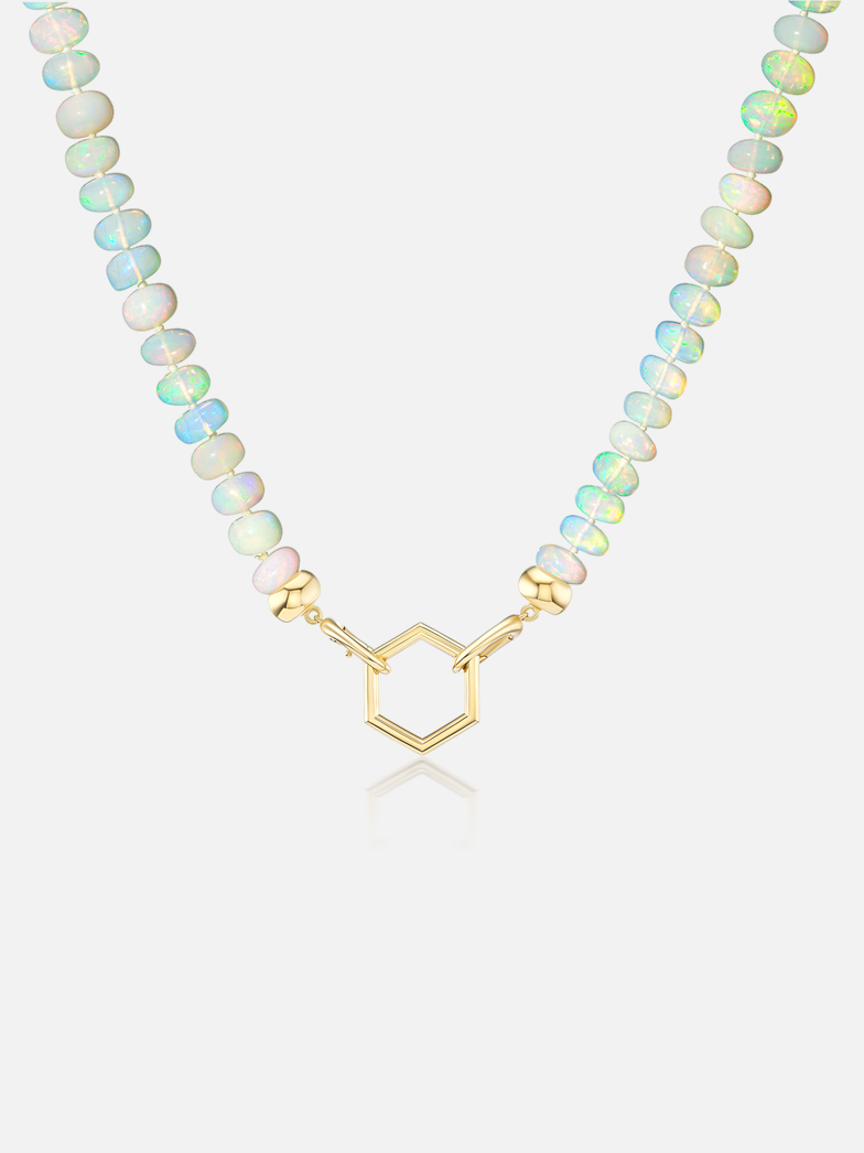Made from a variety of individually hand-knotted and hand-chosen stones, our Open Bail Opal Foundation necklace can be worn alone or paired with charms. This necklace can be worn in a multitude of ways: with the Hexagon to the front alone, with the addition of charms, or to the back, allowing the beads to take center stage.