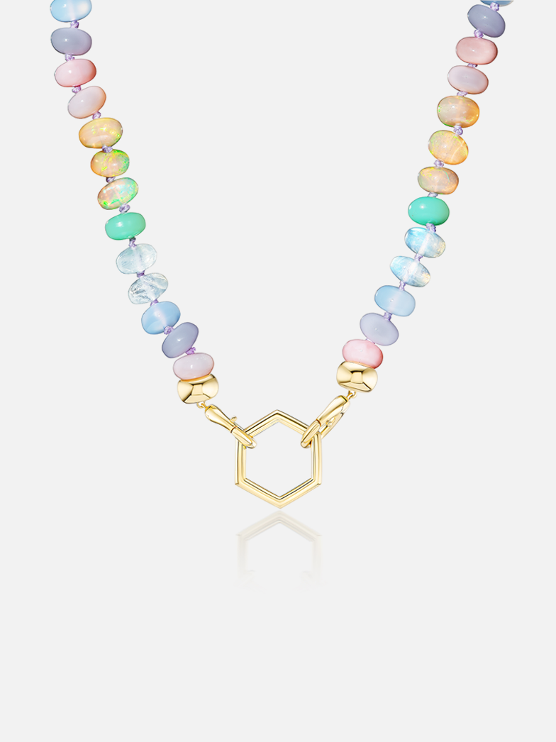 Made from a variety of individually hand-knotted and hand-chosen stones, our Open Bail Opal Foundation necklace can be worn alone or paired with charms. This necklace can be worn in a multitude of ways: with the Hexagon to the front alone, with the addition of charms, or to the back, allowing the beads to take center stage.