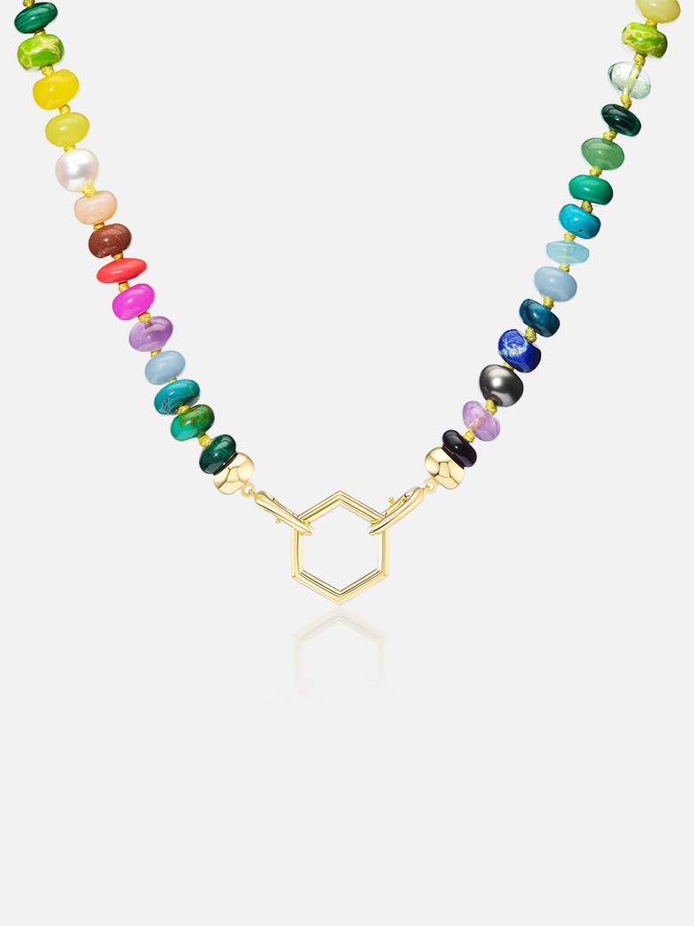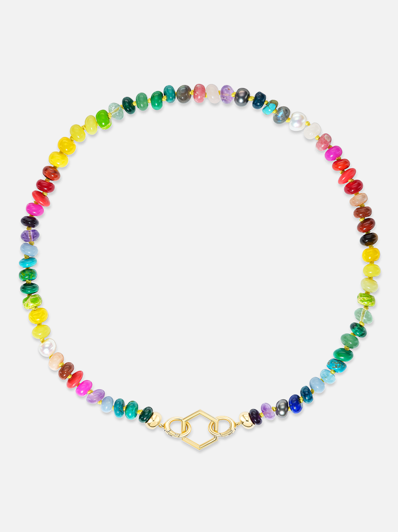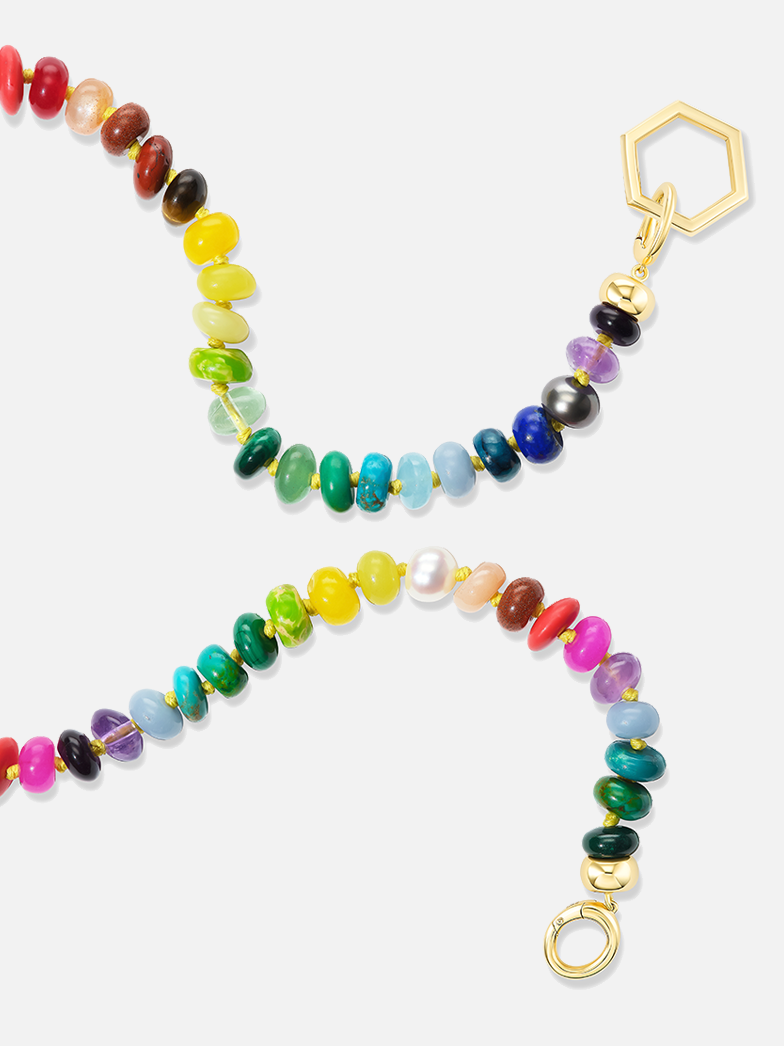Made from a variety of individually hand-knotted and hand-chosen stones, our Open Bail Rainbow Bead Foundation necklace can be worn alone or paired with charms. This necklace can be worn in a multitude of ways: with the Hexagon to the front alone, with the addition of charms, or to the back, allowing the beads to take center stage.