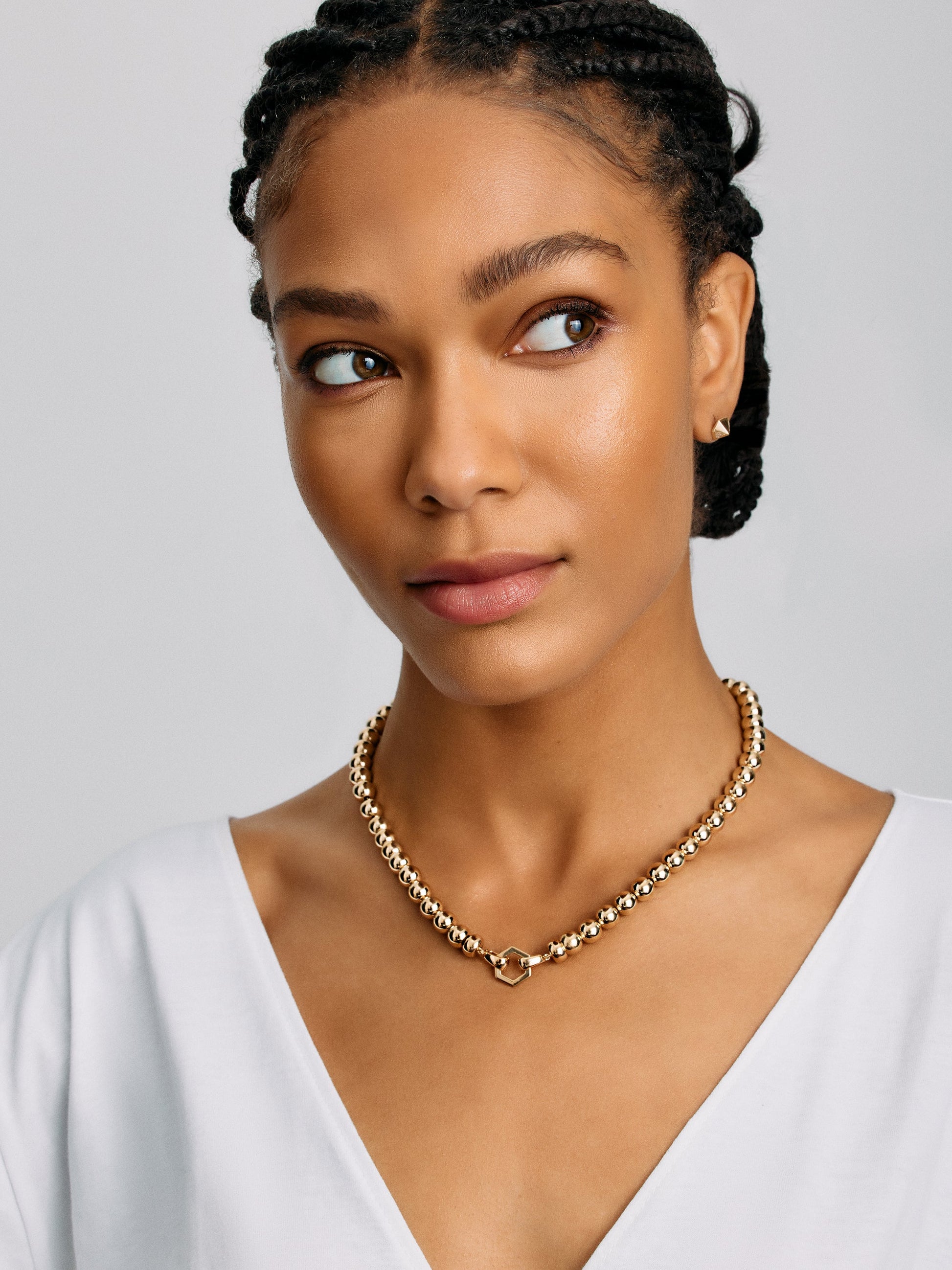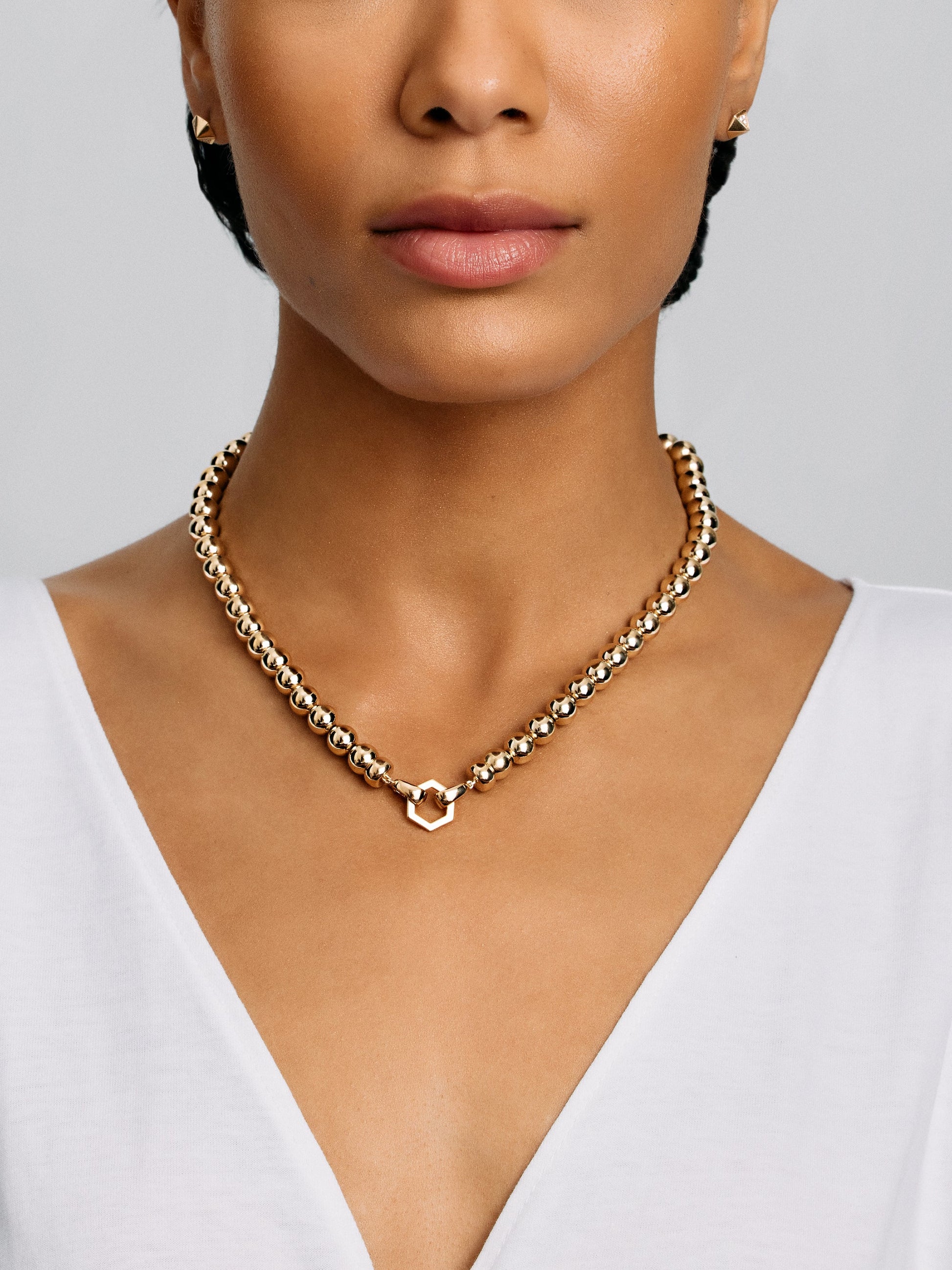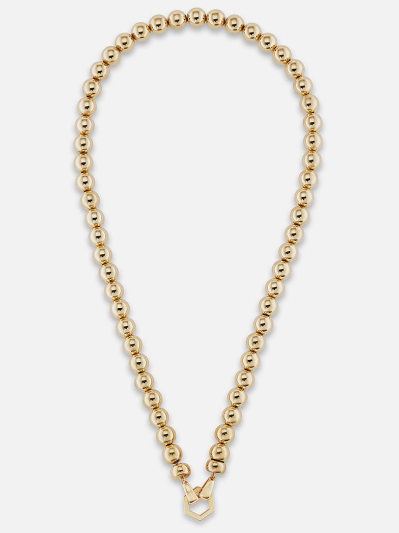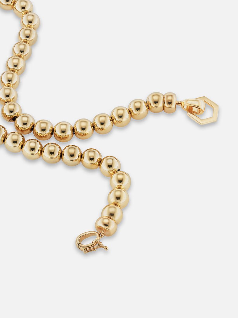 Playful, luxurious and silky to the touch, this large-scale take on a bead chain is the perfect addition to any jewelry wardrobe. Detachable on one end from the gold Foundation clasp, this necklace can be worn in a multitude of ways: with the Hexagon to the front alone, with the addition of charms, or to the back, allowing a golden reflection to take center stage.