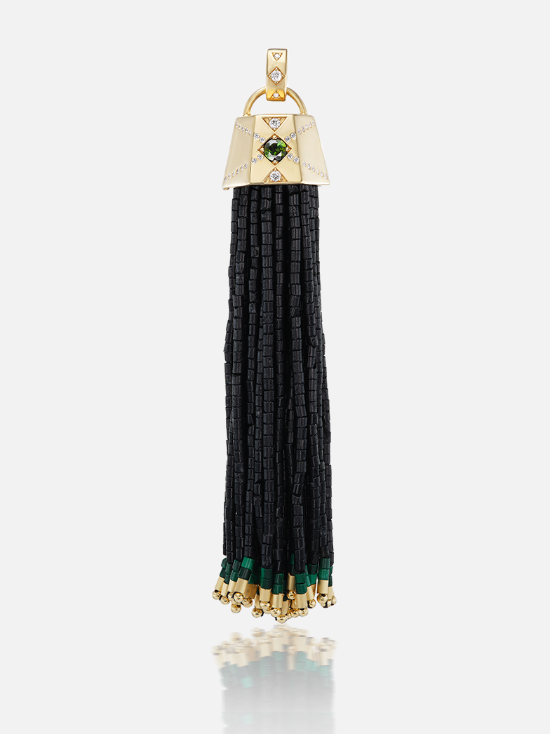 Full of movement and tactile to the touch, each Tassel is made up of hand-chosen gemstone beads and a substantial gold cap. Elegant and opulent, these detachable pendants honor universal ornaments seen in varying versions in many cultures around the globe. A joyous interplay of color, pattern and stones, OTHER DIMENSIONS takes a primitive material — stone beads — and elevates them through the maximalist eye of Harwell Godfrey.