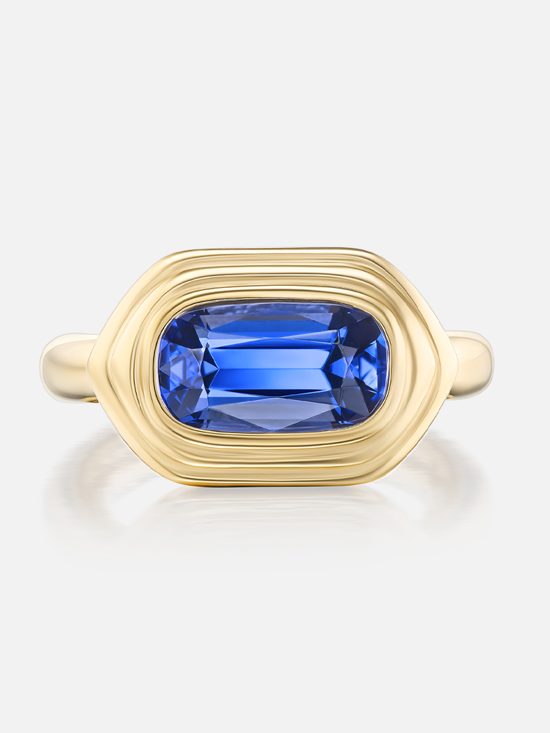 Uncommon Gem: 18k yellow gold, Cairo ring is set with a 3.02ct tanzanite center stone. Its rounded angles and bezel profile give this spectacular ring a decidedly unexpected and altogether enchanting vibe.