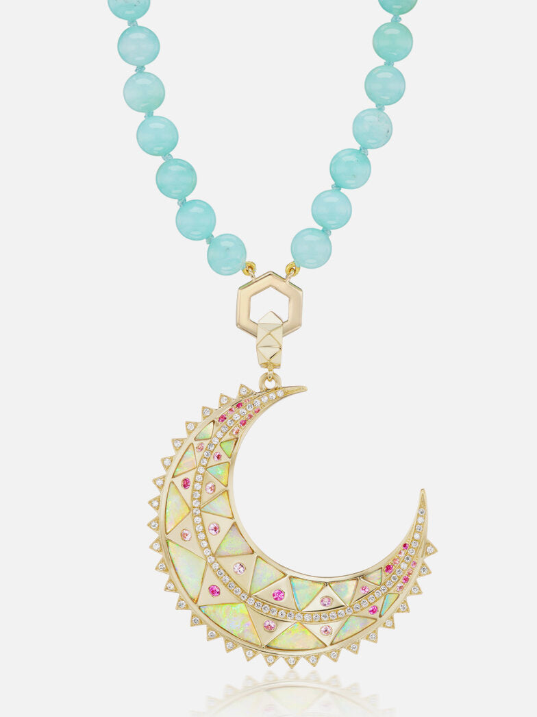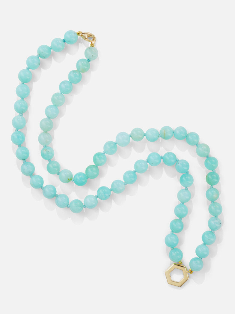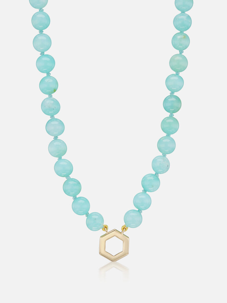 Made from a variety of individually hand-knotted and hand-chosen chrysoprase beads on coordinating silk. This necklace can be worn in a multitude of ways: with the Hexagon to the front alone, with the addition of charms, or to the back, allowing the chrysoprase to take center stage. Each strand has unique variations due to the use of natural stones and features a solid 18k gold hexagon Foundation jump ring.