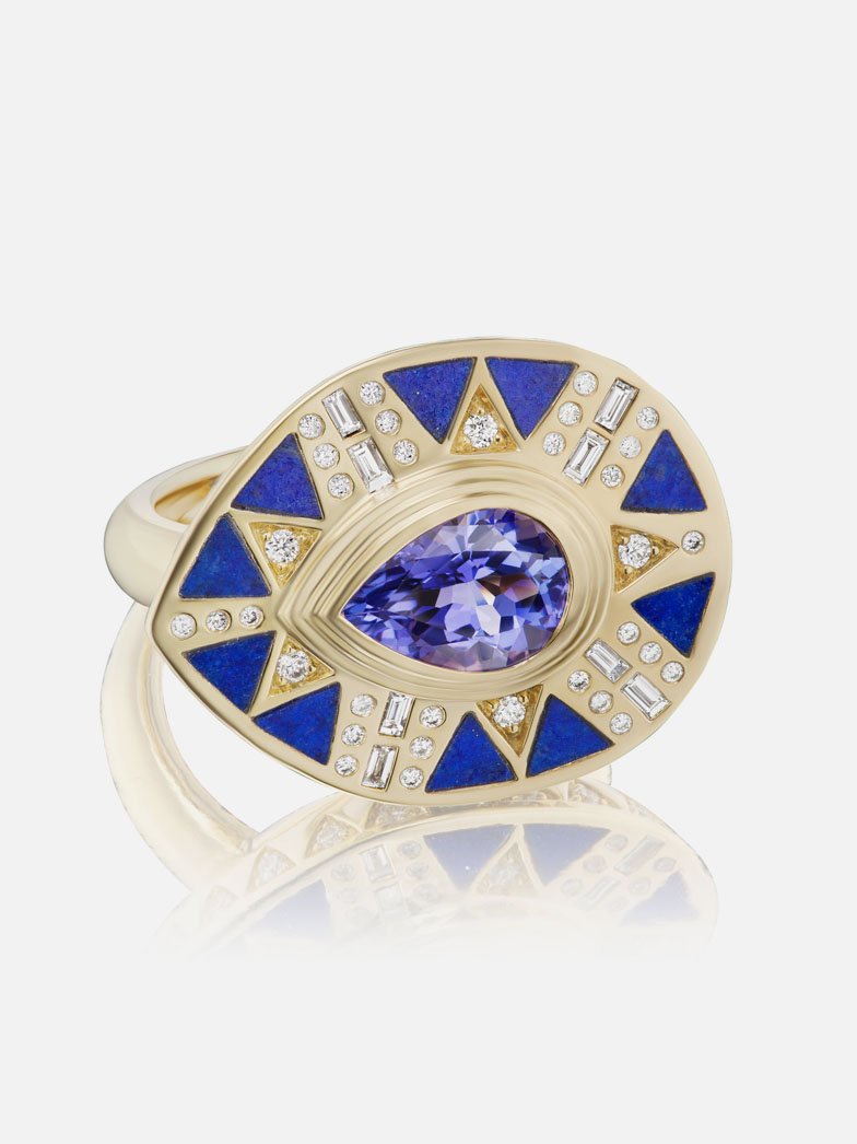Captivated with the saturated colors and seductive powers of large-scale gemstones, designer Lauren Harwell Godfrey traveled back in time to ancient Egypt for her newest collection, Cleopatra’s Vault. Eschewing a literal interpretation of serpent-inspired cuffs, Godfrey instead used her signature triangle inlay — a nod to the Pyramids — and specific statement gems and silhouettes befitting a modern-day queen.