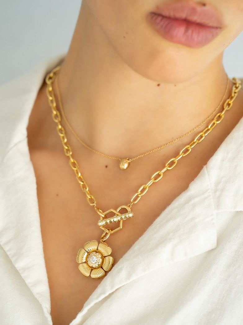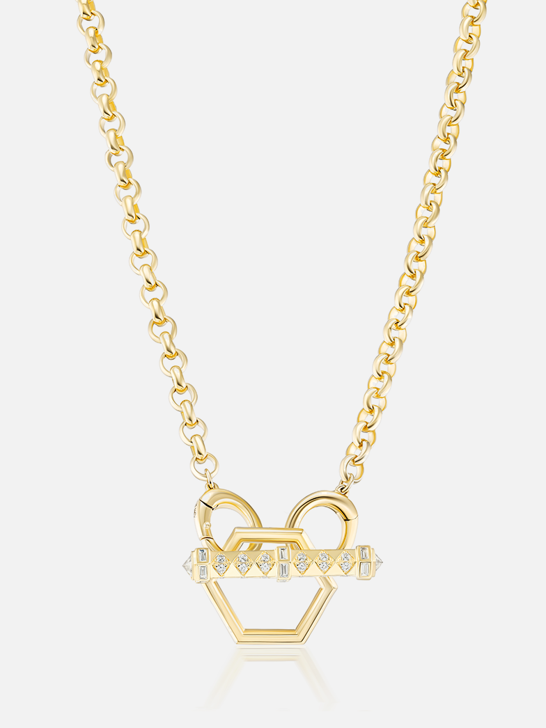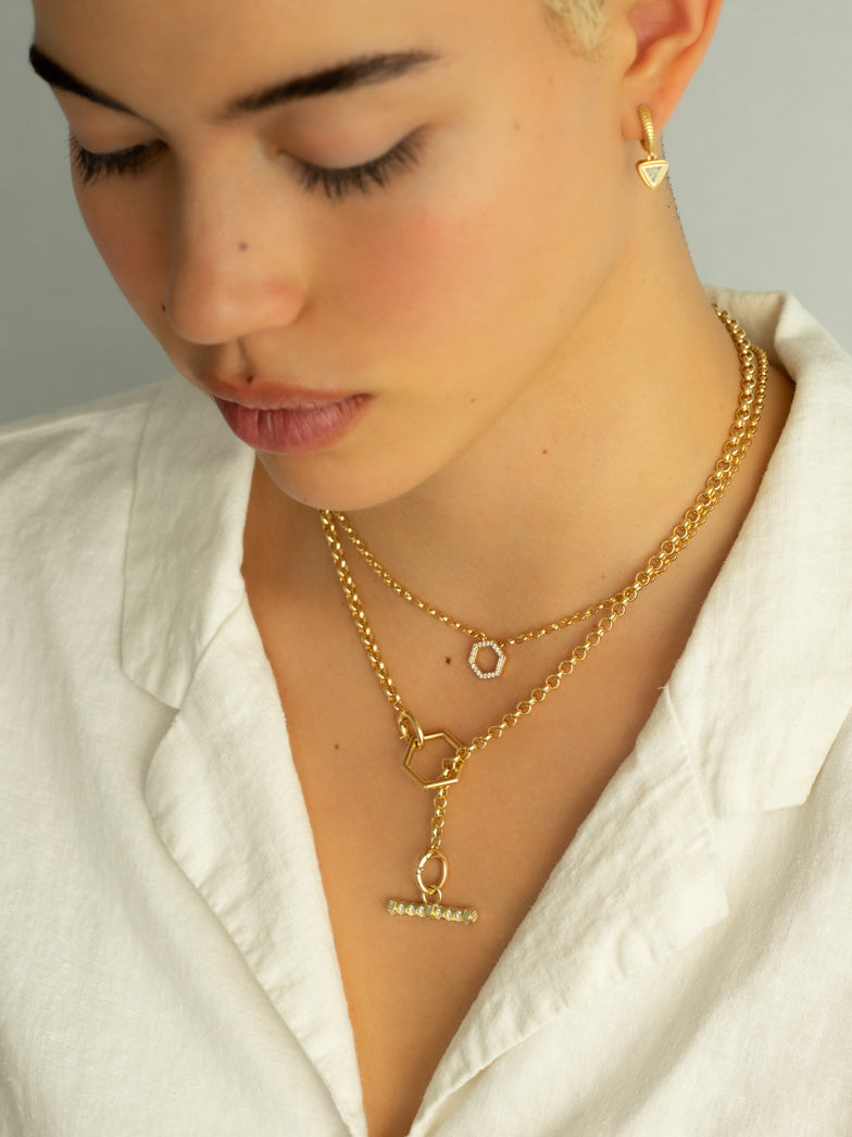 18k yellow gold, hexagon toggle enhancer. Add dimension to our open bail foundation chains or beads.