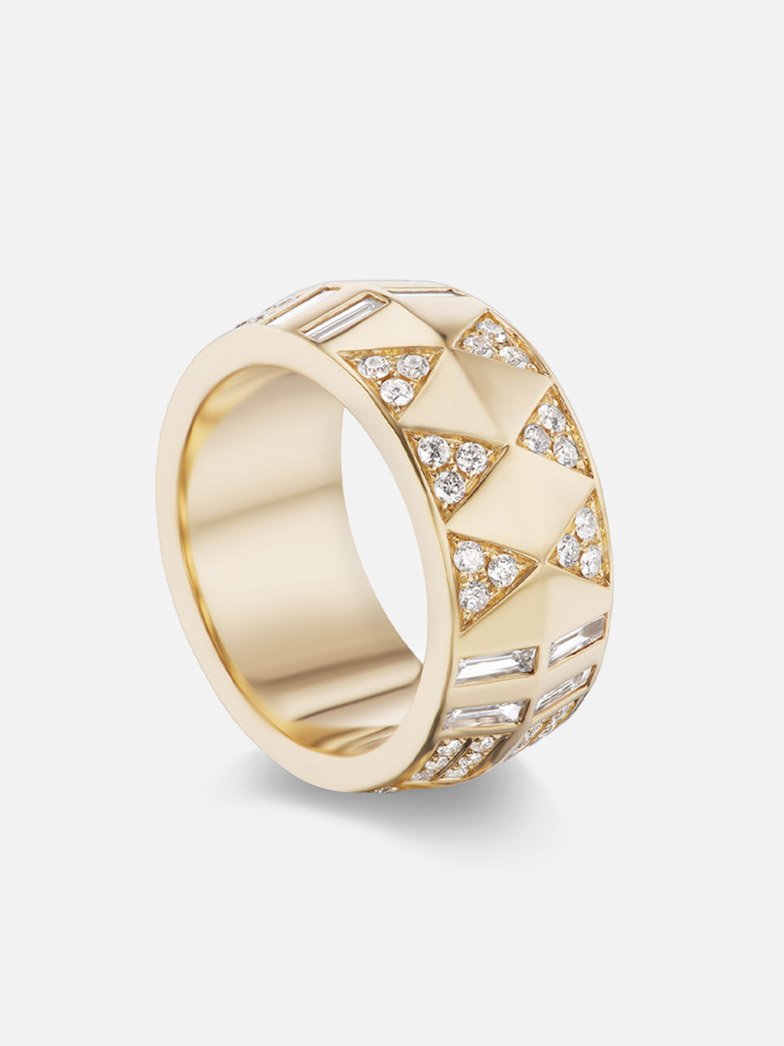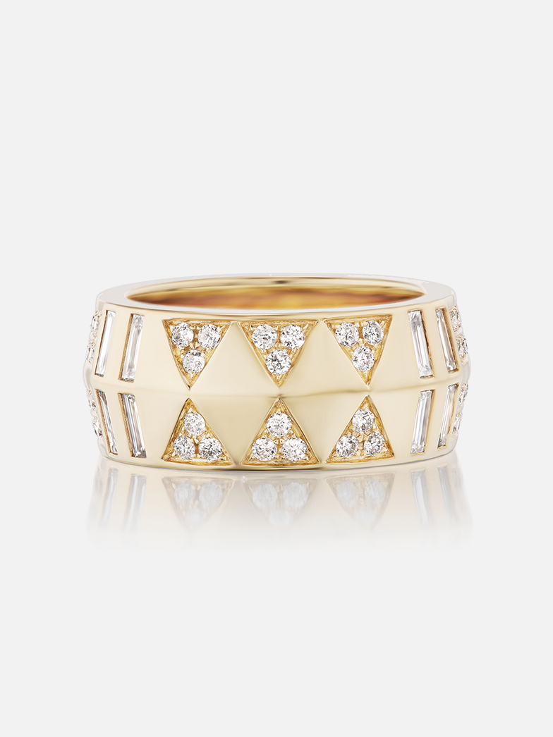 18k yellow gold Knife Edge cigar band with geometric diamond details.