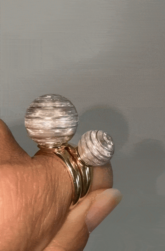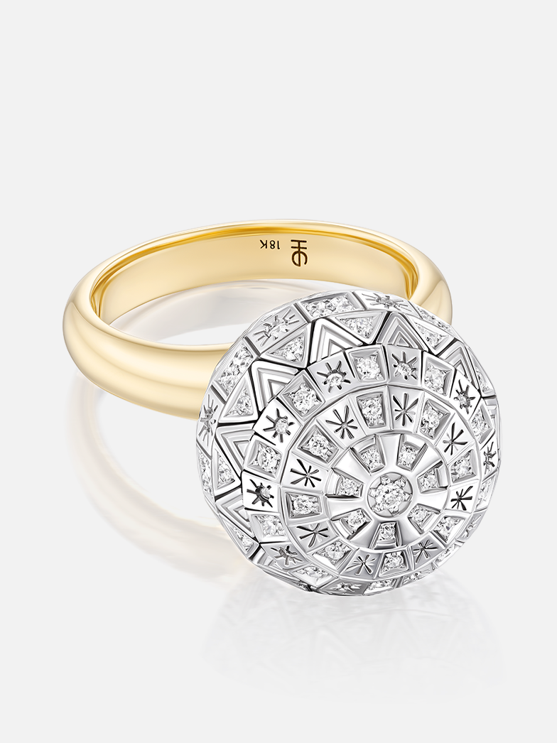 Each piece in the Disco capsule is crafted with my signature design elements: engraved lines, pyramid shapes, and a constellation of sparkling diamonds in varying scales and compositions. The mixed-metal construction—18k yellow gold settings paired with 18k white gold and diamond-studded spheres—marks an exciting new design direction for the brand. And yes, every piece spins—because how could they not?