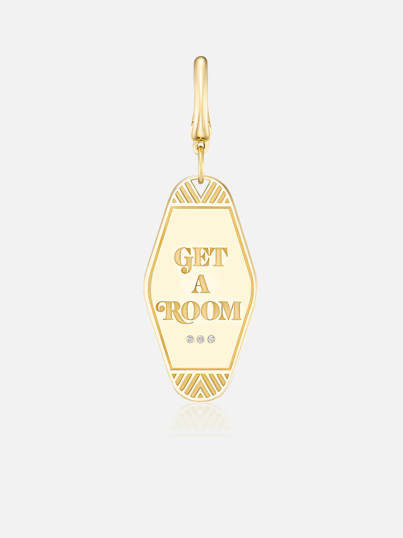 Made to order in 8-10 weeks. 18k yellow gold 'get a room' keychain charm pendant.