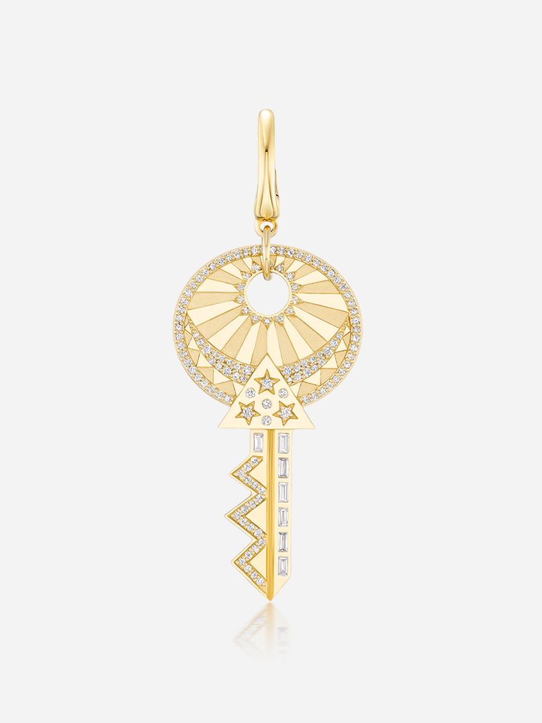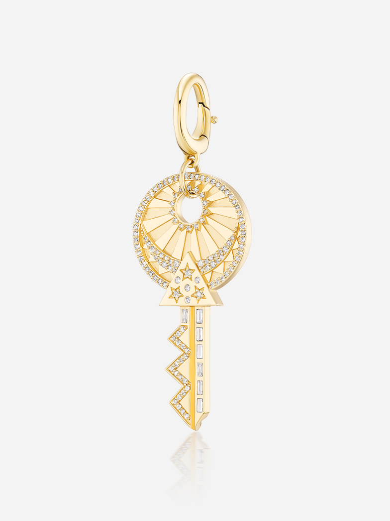 Made to order in 8-10 weeks. 18k yellow gold key to the universe charm pendant with diamond details.
