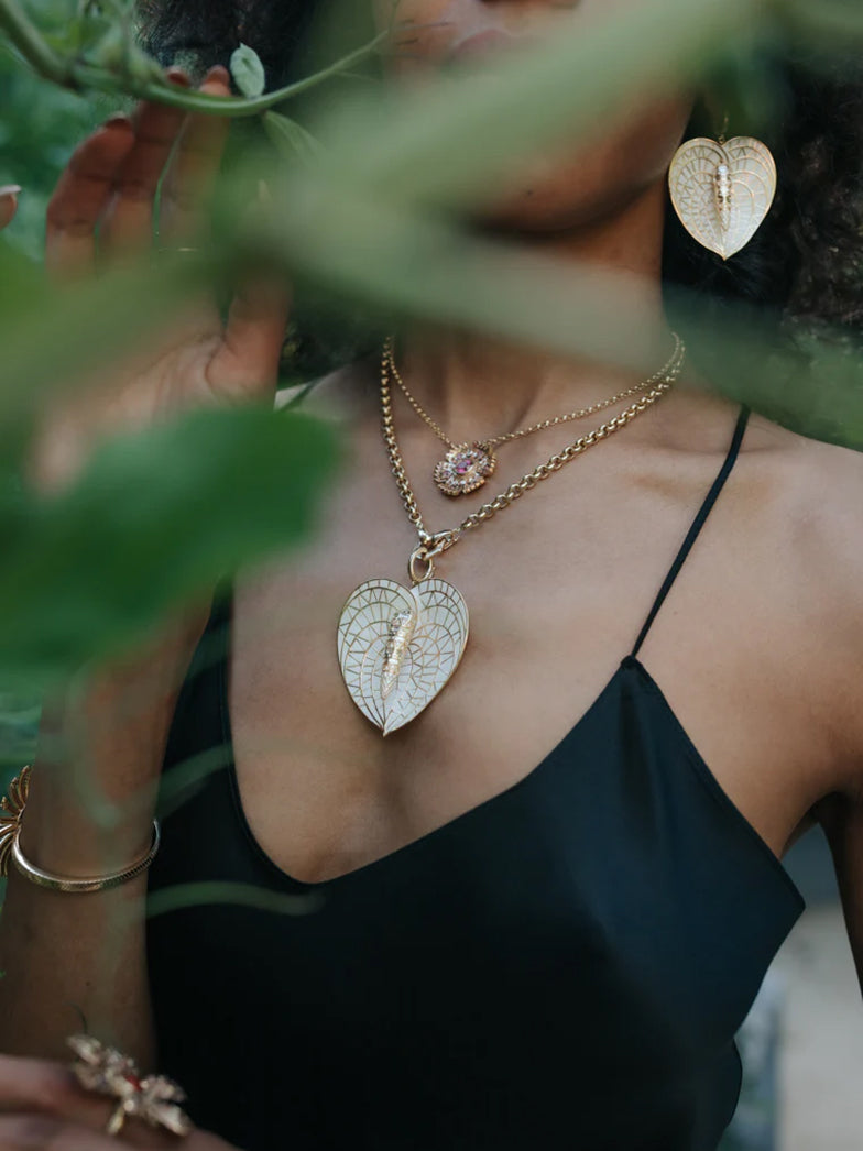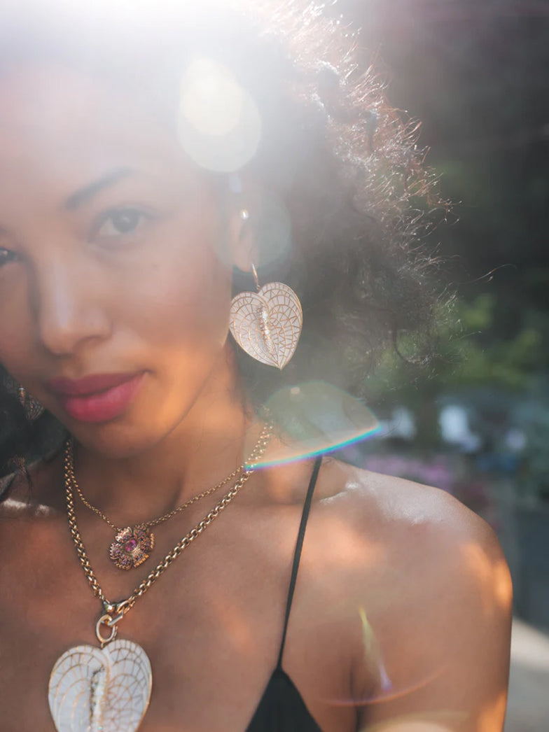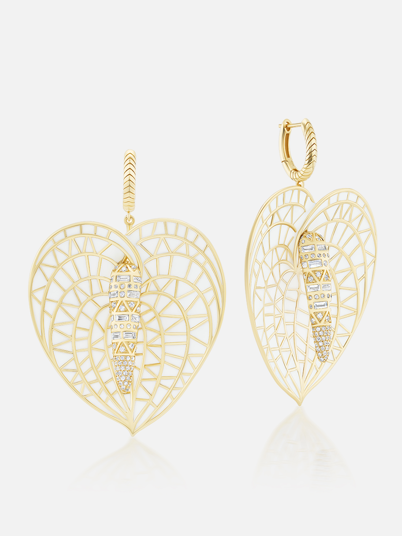 18k yellow gold, white enamel and diamond lily drop huggie earrings. Sold as a pair.