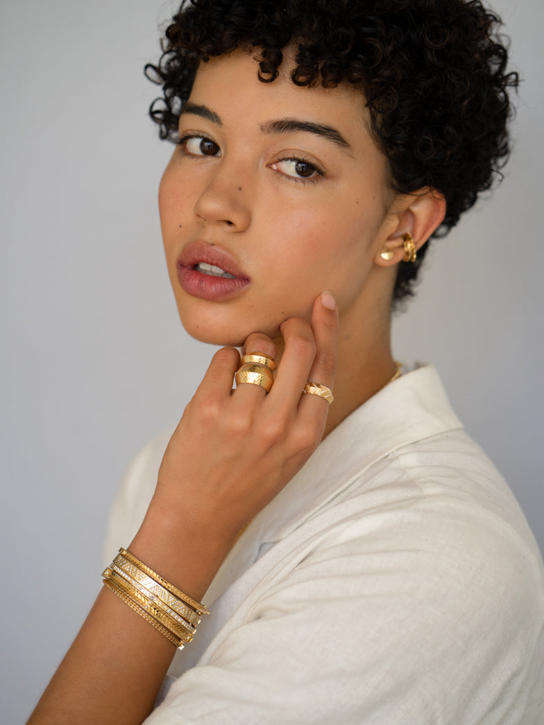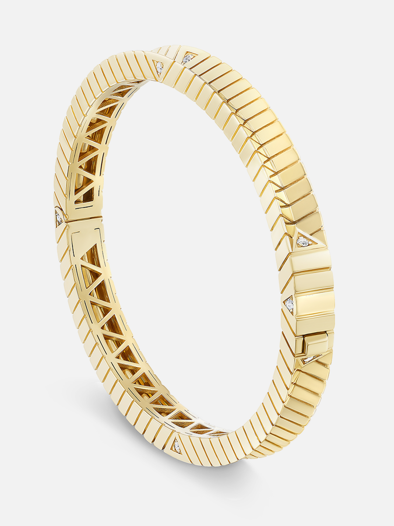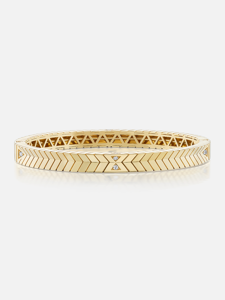 Inspired by our founder Lauren Harwell Godfrey’s travels to Egypt. According to Godfrey, “I was very inspired by my time in Luxor, especially in visiting the Valley of the Queens and the beautiful tomb of Queen Nefertari. I was inspired to make a bangle in the inverse of a pyramid or knife edge, more of an inverted shape as a nod to that Valley. Crafted in 18k yellow gold and diamonds, it features a light catching texture based on a repetitive linear pattern I saw in several ancient sites as well as diamond pyramids within the bangle itself. It makes a beautiful statement on its own, but the unusual shape makes it a perfect one to add to a stack.”