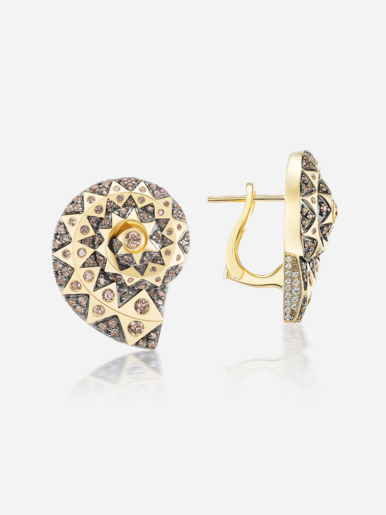 18k yellow gold, champagne diamond shell button earrings. Sold as a pair.