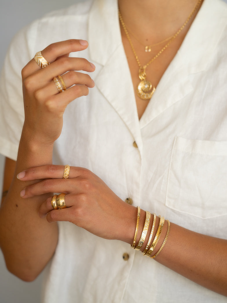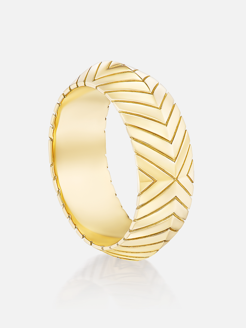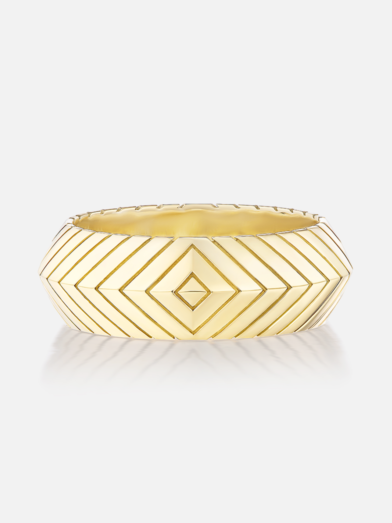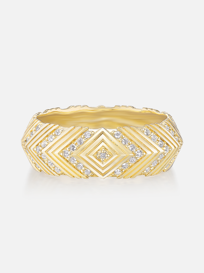 18k yellow gold masego knife edge band with diamond pave and engraved details.